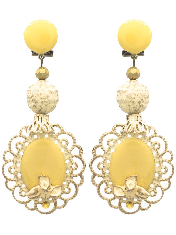 Enameled ivory flamenco earring with golden highlights. Metal fittings Omega closure Measures: 35 x 75 mm (without head). Handmade in Seville.