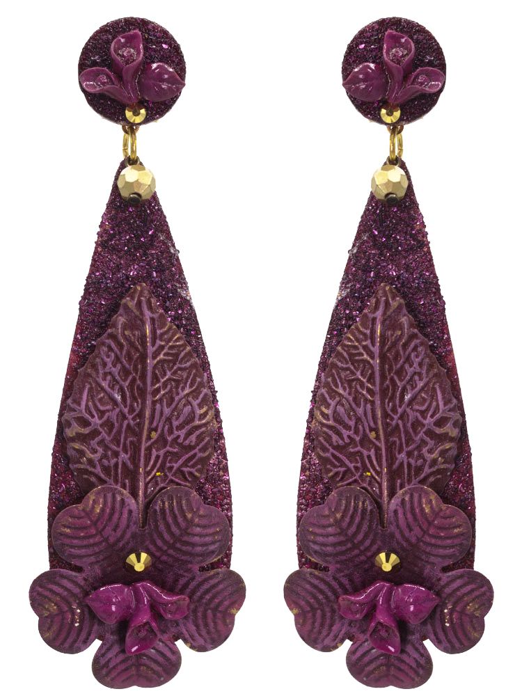 Flamenco bougainvillea earring with teardrop shape, floral detail, metal fittings and mother of pearl powder. Omega closure and with measures: 30 x 80 mm (without head). Handmade in Seville.