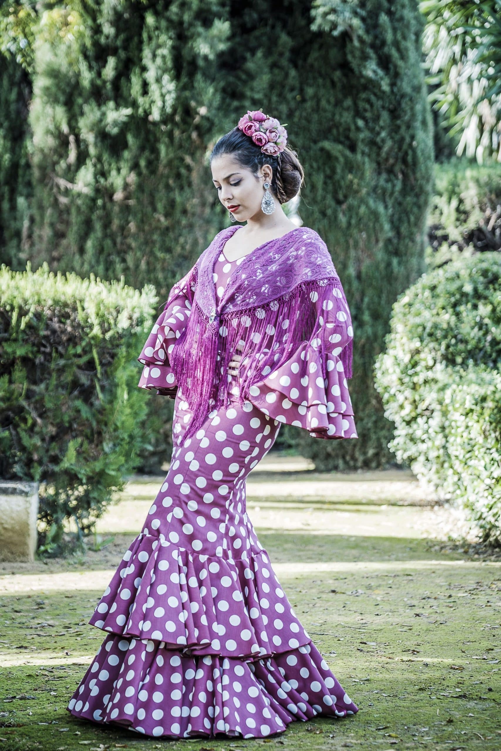 Flamenco poplin costume in bougainvillea color with white polka dots. French sleeves with cape ruffles. V-neckline front and back. The flared skirt has two ruffles of layer. Size 38.