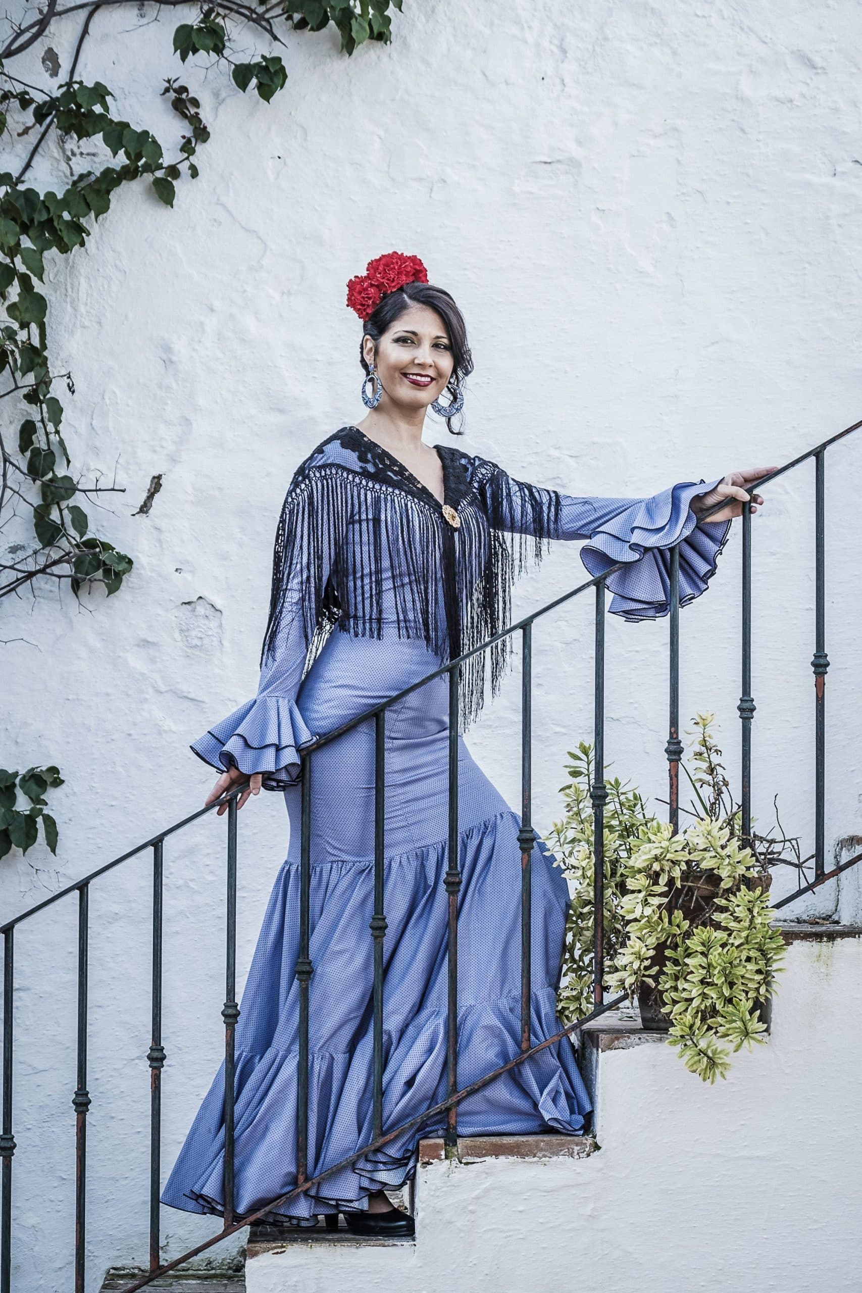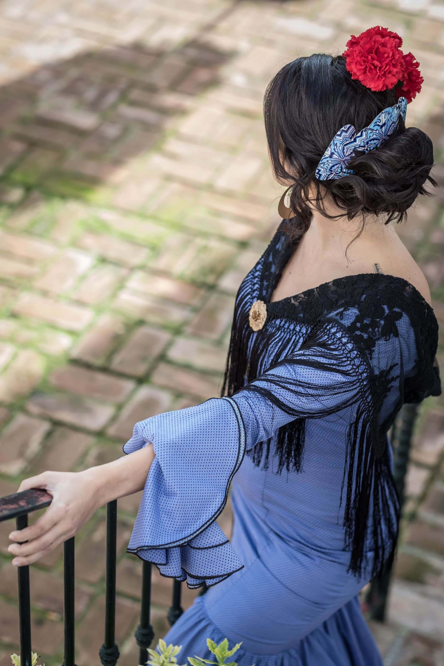 Batiste costume in blue with black moons. French sleeves with cape ruffles. V-neckline front and back. The skirt is a large layer, with a ruffle on the edge of the layer. Size 38