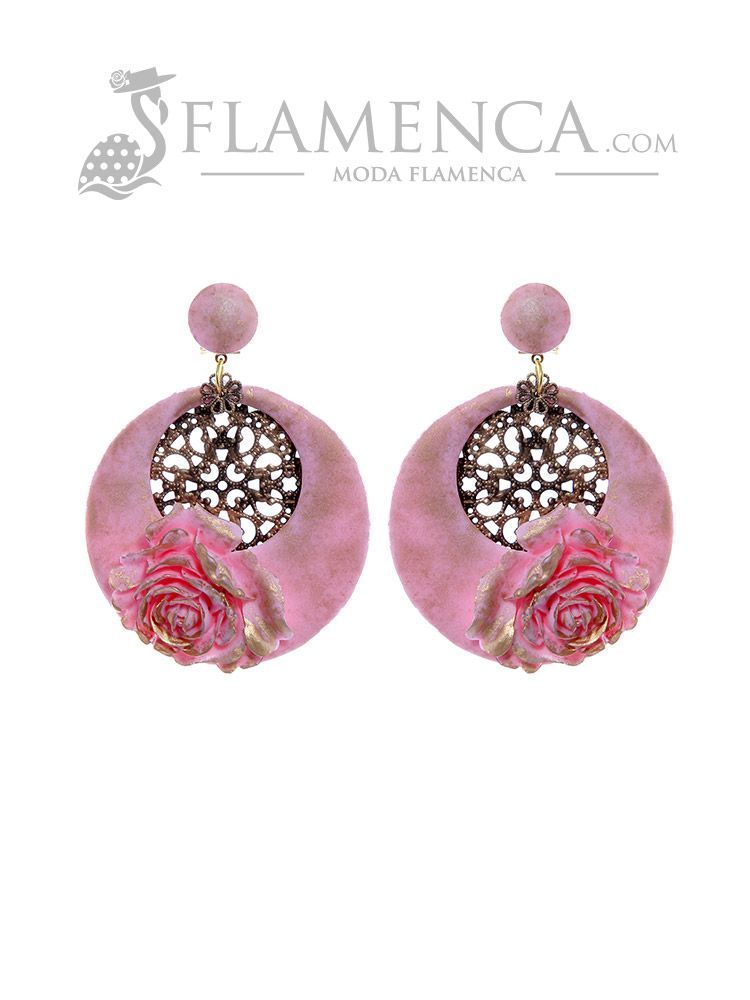 Flamenca earring in baby pink color with gold highlights, ring-shaped, floral detail, metal fittings, omega closure, and with measures: 63 x 63 mm (without head). Handmade in Seville.