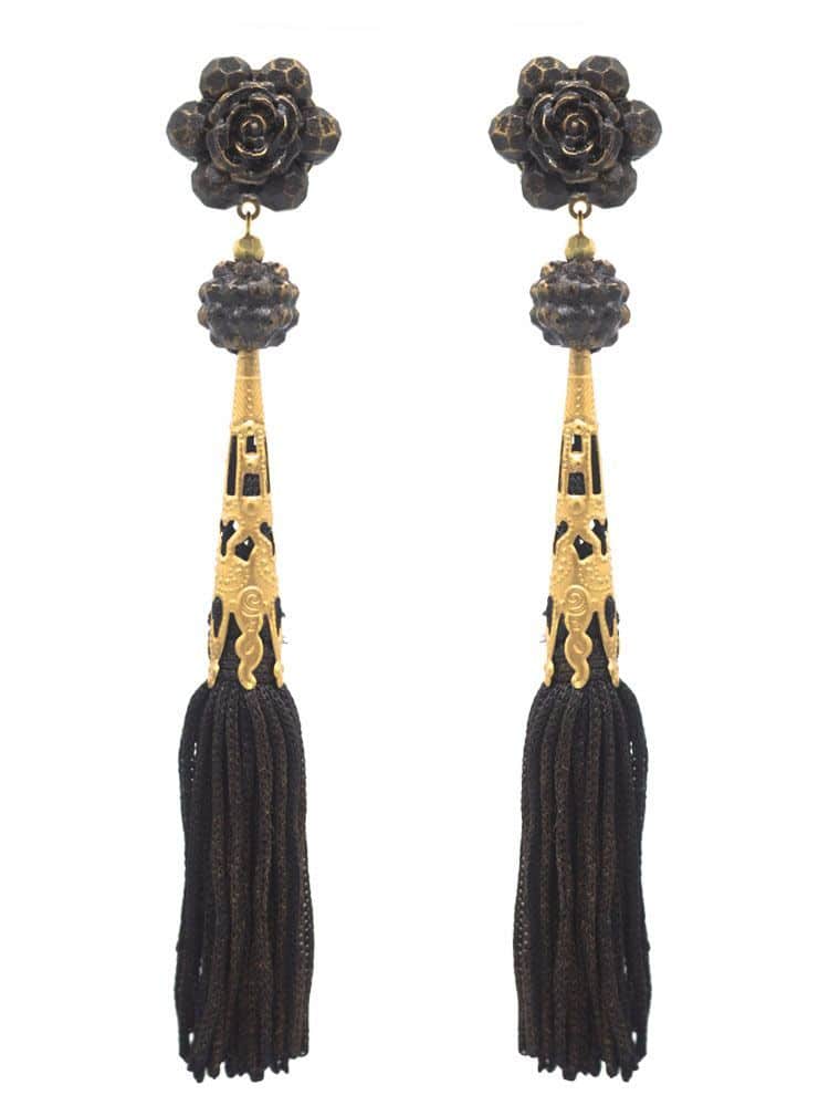 Flamenco earring with black fringes and golden highlights. Metal fittings and fringes. Omega closure. Measures: 10 x 110 mm (without head). Handmade in Seville.