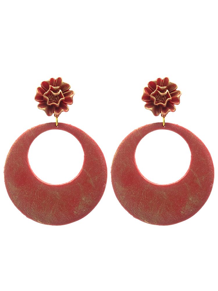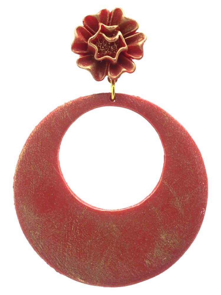 Flamenco earring in the shape of a red hoop with gold highlights and floral detail in stud. Omega closure and with measures: 50 x 50 mm (without head). Handmade in Seville.