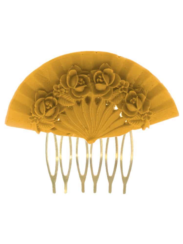 Flamenca comb floral resin fan color albero. Metallic gilded combs that facilitate the grip of flamenco hair and measures: 60 x 30 mm. 2 are recommended for a more complete look. Handmade in Seville.