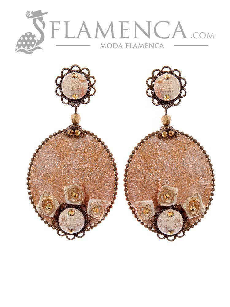 Flamenco earring in ivory color, with oval shape, metal fittings, omega closure, and with measures: 49 x 75 mm (without head). Handmade in Seville.