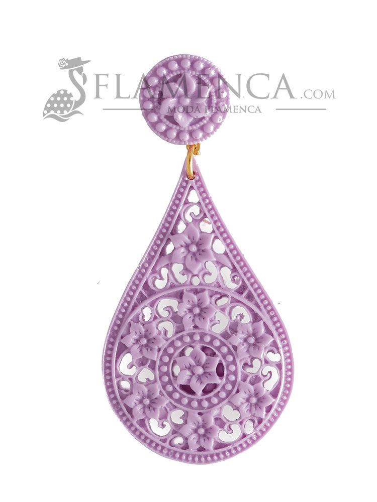 Resin flamenco earring, in mauve, teardrop-shaped, filigree, floral style, omega closure and a size of 34 x 53 mm, medium size. Handmade in Seville.