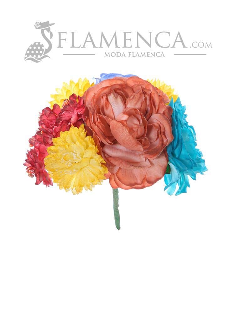 Multicolour flamenco bouquet, approximate diameter of 16 cms. It can be manipulated and converted into a tiara. Crafted in Seville.