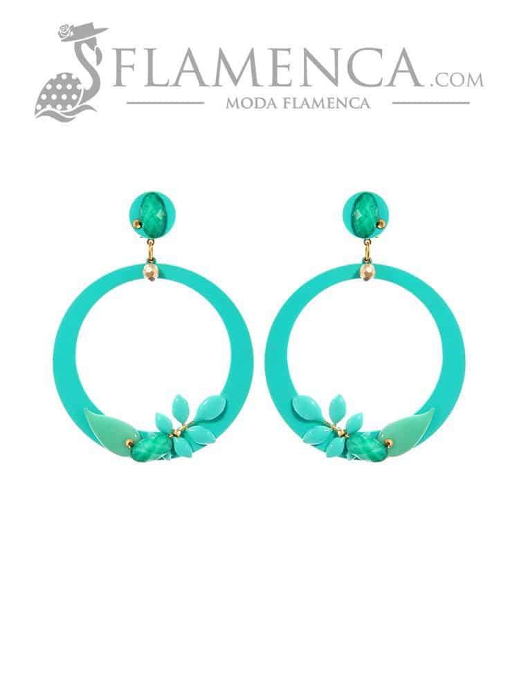 Pendiente de flamenca en color verde agua, con forma de aro, fornitura metálica, cierre omega, y con medidas: 72 x 72 mm (sin cabezal). Fabricado artesanalmente en Sevilla.