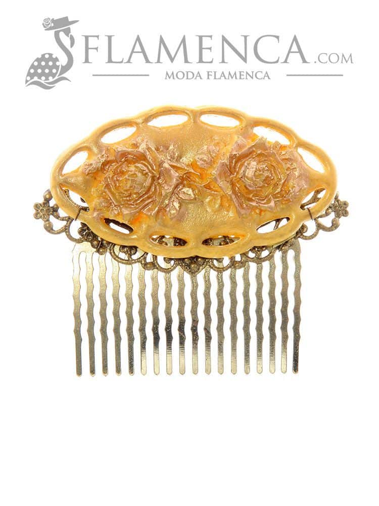 Flamenco comb in yellow with gold highlights, floral detail, metallic combs that facilitate the grip to the flamenco hair, and with measures of: 80 x 70 mm. 2 are recommended for a more complete look. Handmade in Seville.