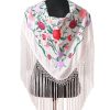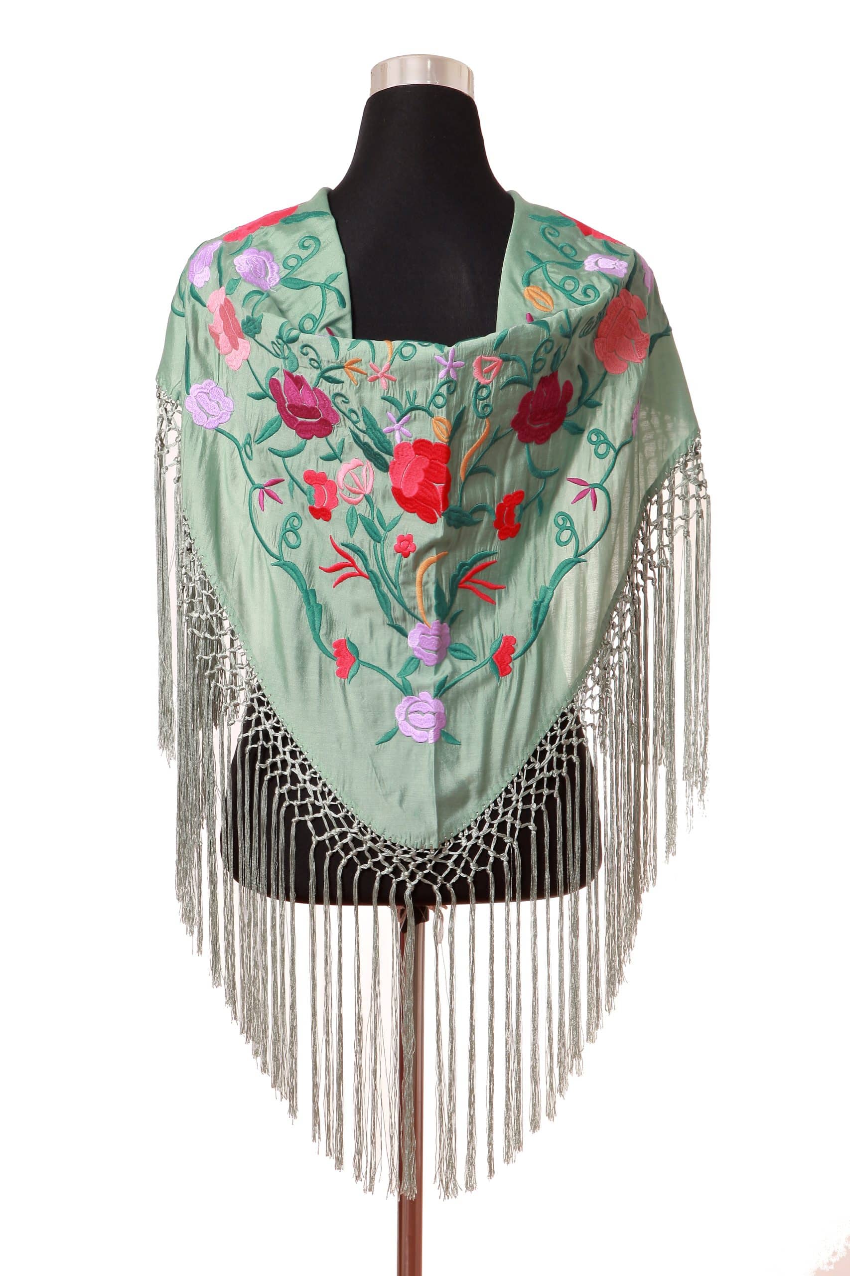 Mantón color verde jabonoso bordado en multicolor de algodón flecado en mano con borlón en seda y enrejado en seda natural. Medidas 135x60cm aprox. (Sólo el mantón) más los flecos 25 cm (incluyendo el enrejado). Fabricado artesanalmente en la provincia de Sevilla.