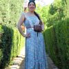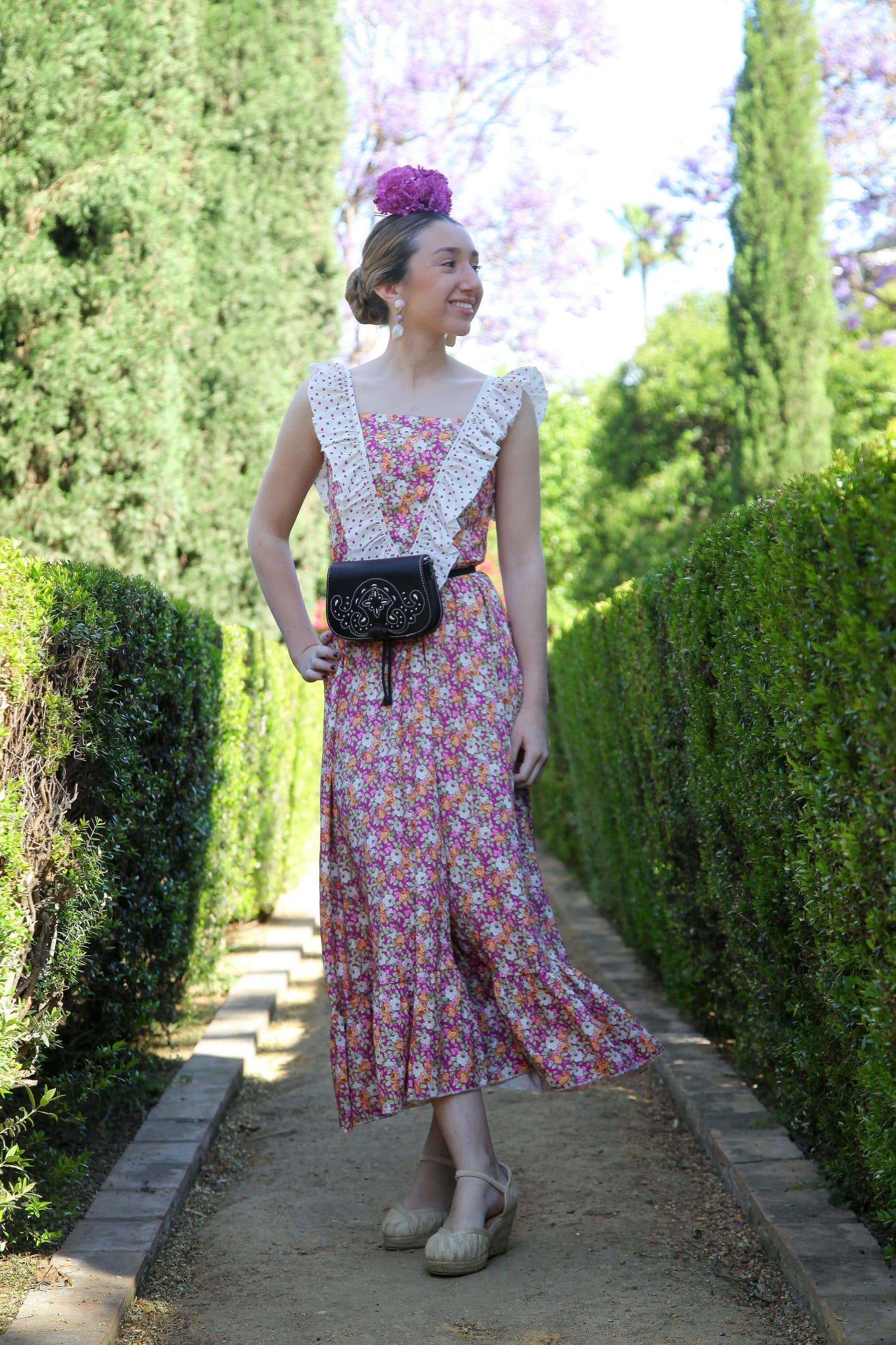 Bata rociera con tejido fluído en tono buganvilla con estampado de flores.