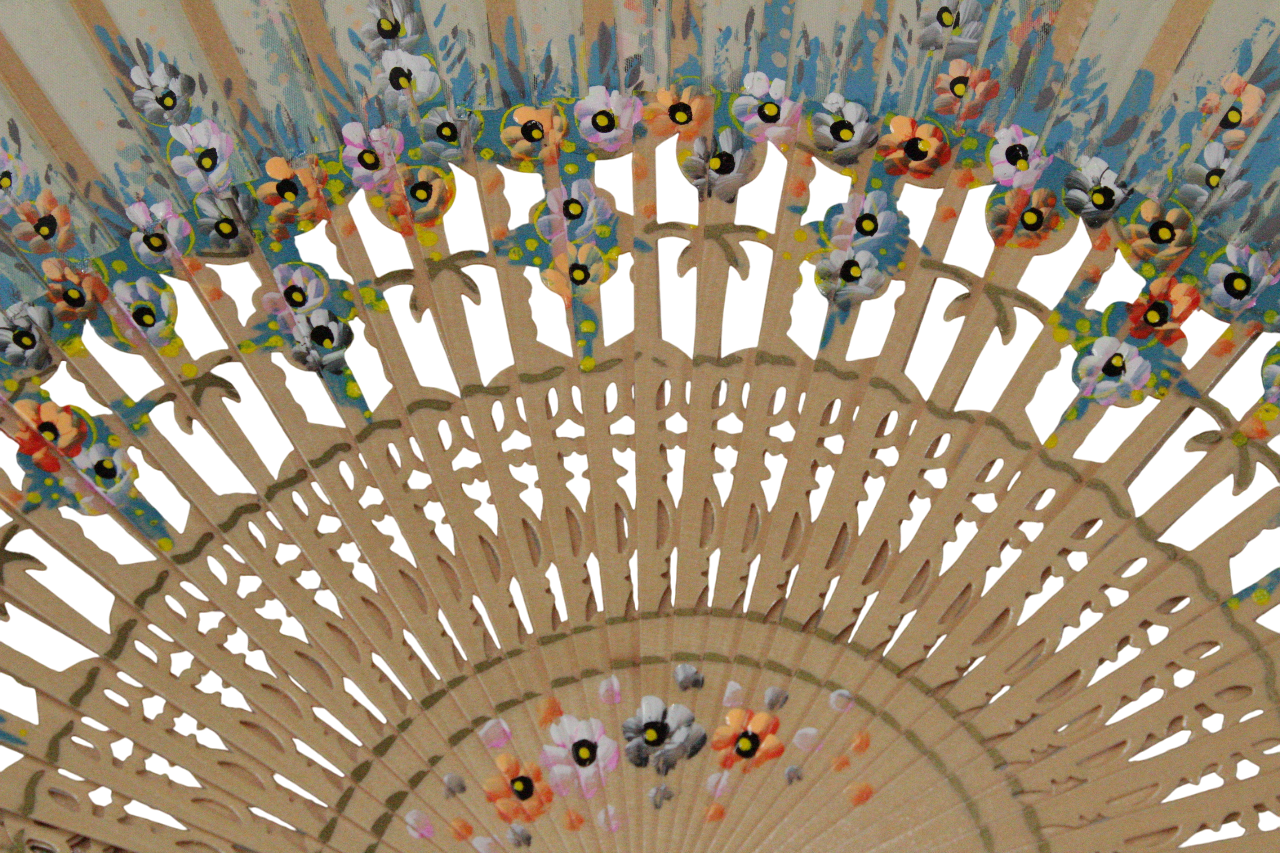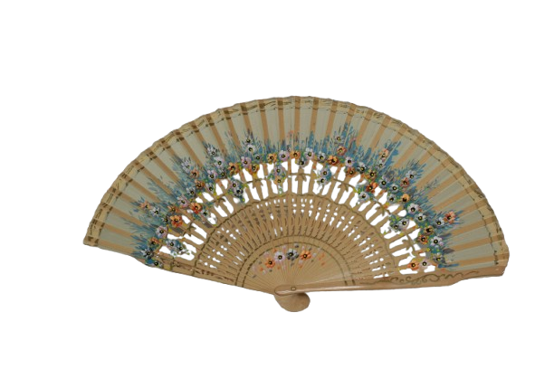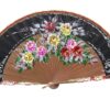 Abanico de color avellana con flores pintadas multicolor y varillas talladas con multitud de detalles.