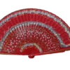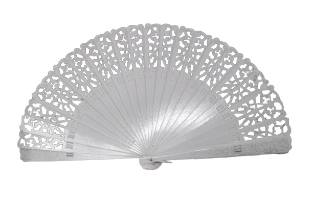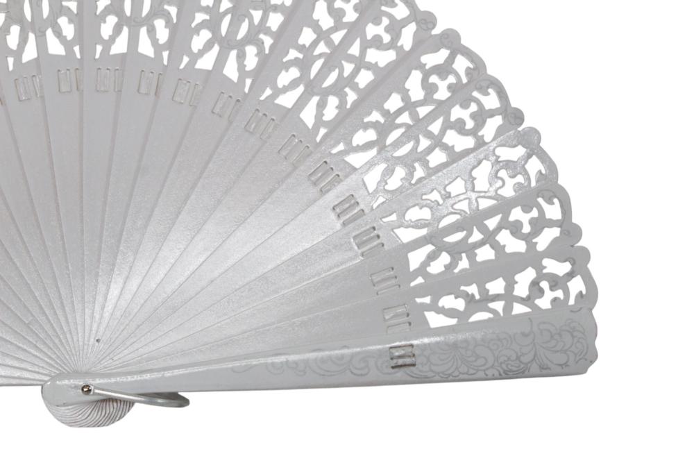 Abanico blanco con varillas de diseño y detalles florales plateados.