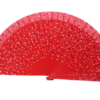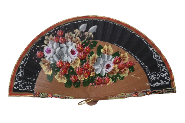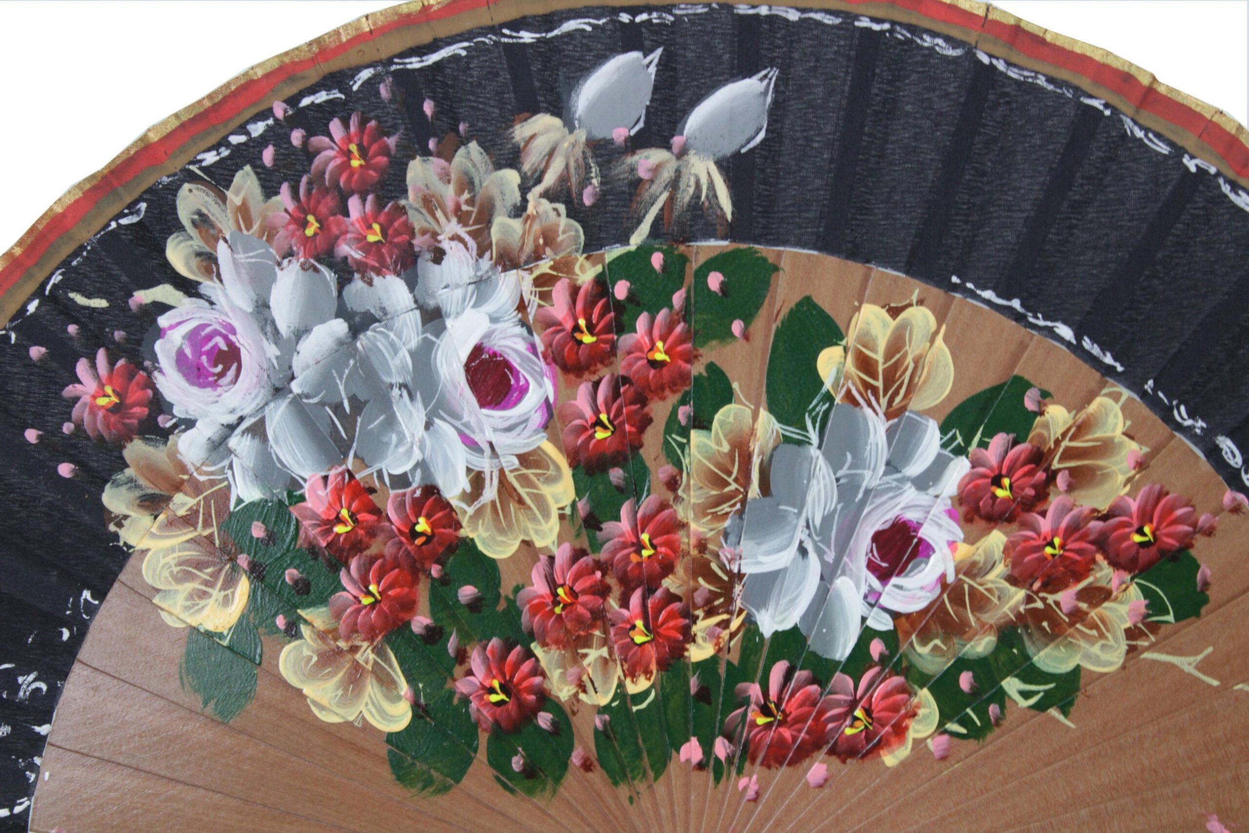 Abanico de diseño de flores pintadas a mano y detalles en el ribete en rojo y dorado. Pala del abanico esculpida con detalles florales de inspiración modernista.