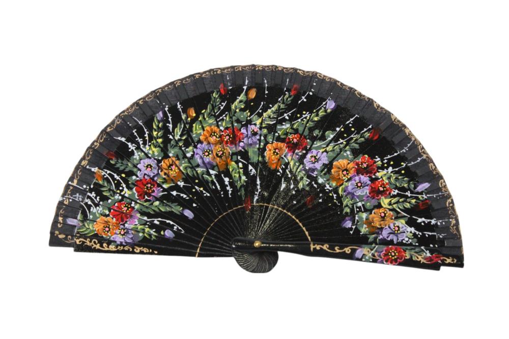 Abanico negro pintado a mano de multitud de flores multicolor. Detalles dorados en el ribete del abanico.