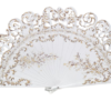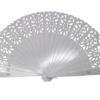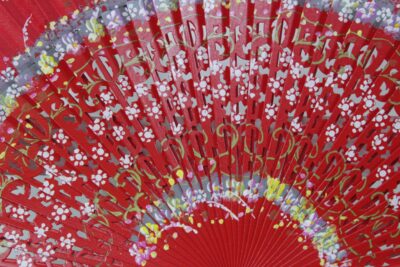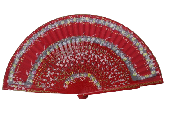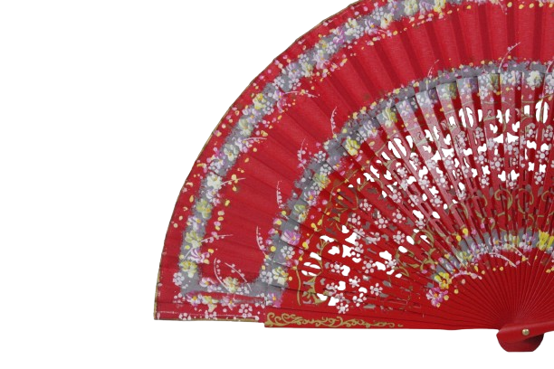 Abanico rojo de madera y con tela roja pintada a mano de flores multicolores y tiras grises.