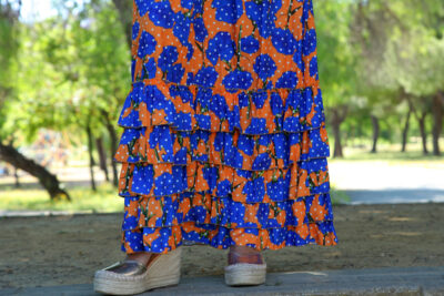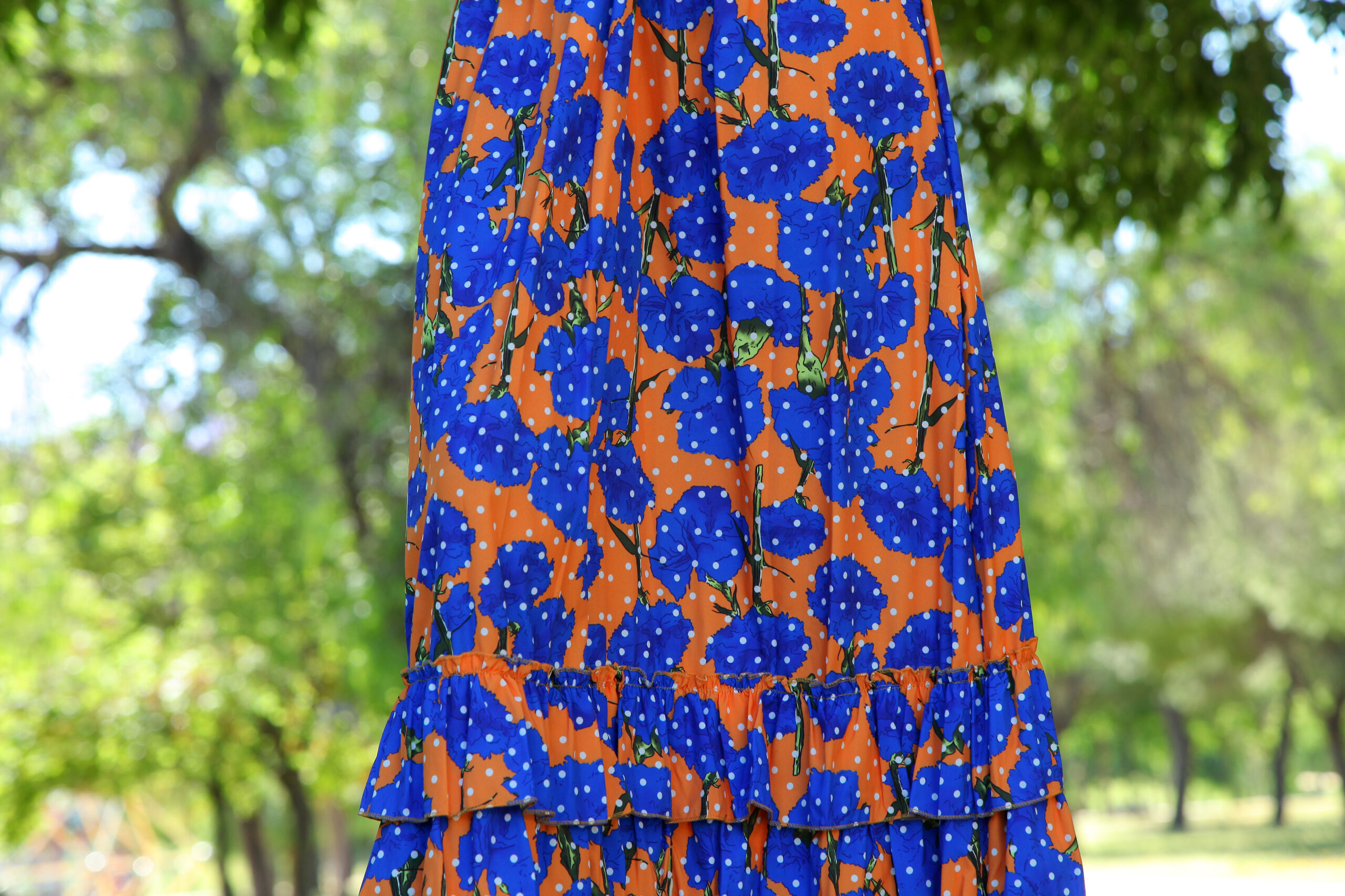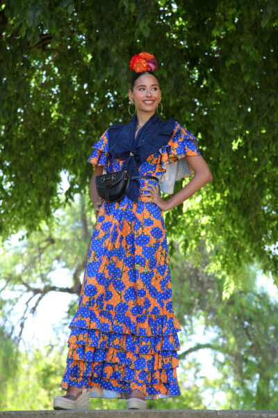 Bata rociera de volantes con estampado de flores y fruncido en el pecho con mangas de volantitos.