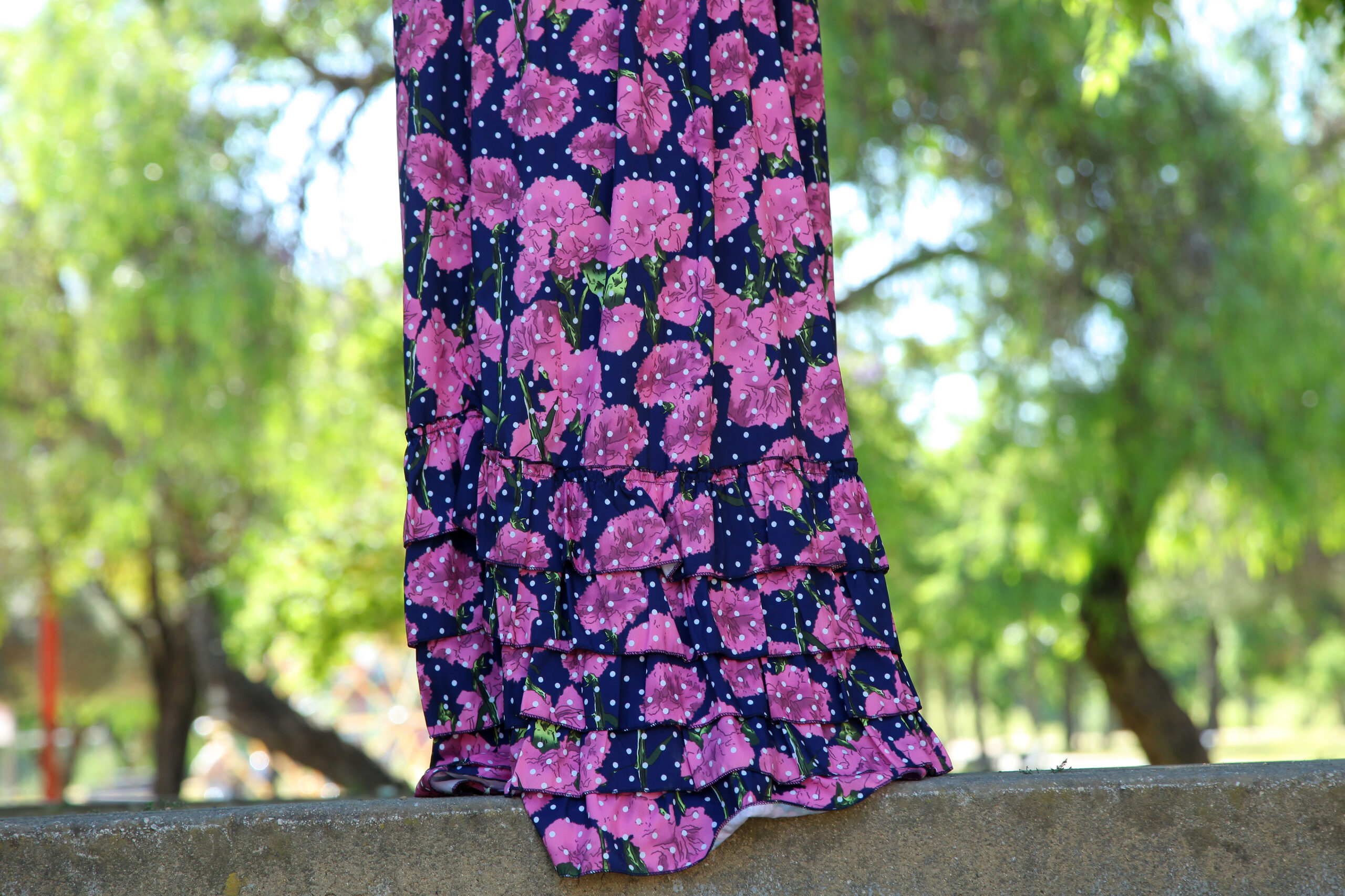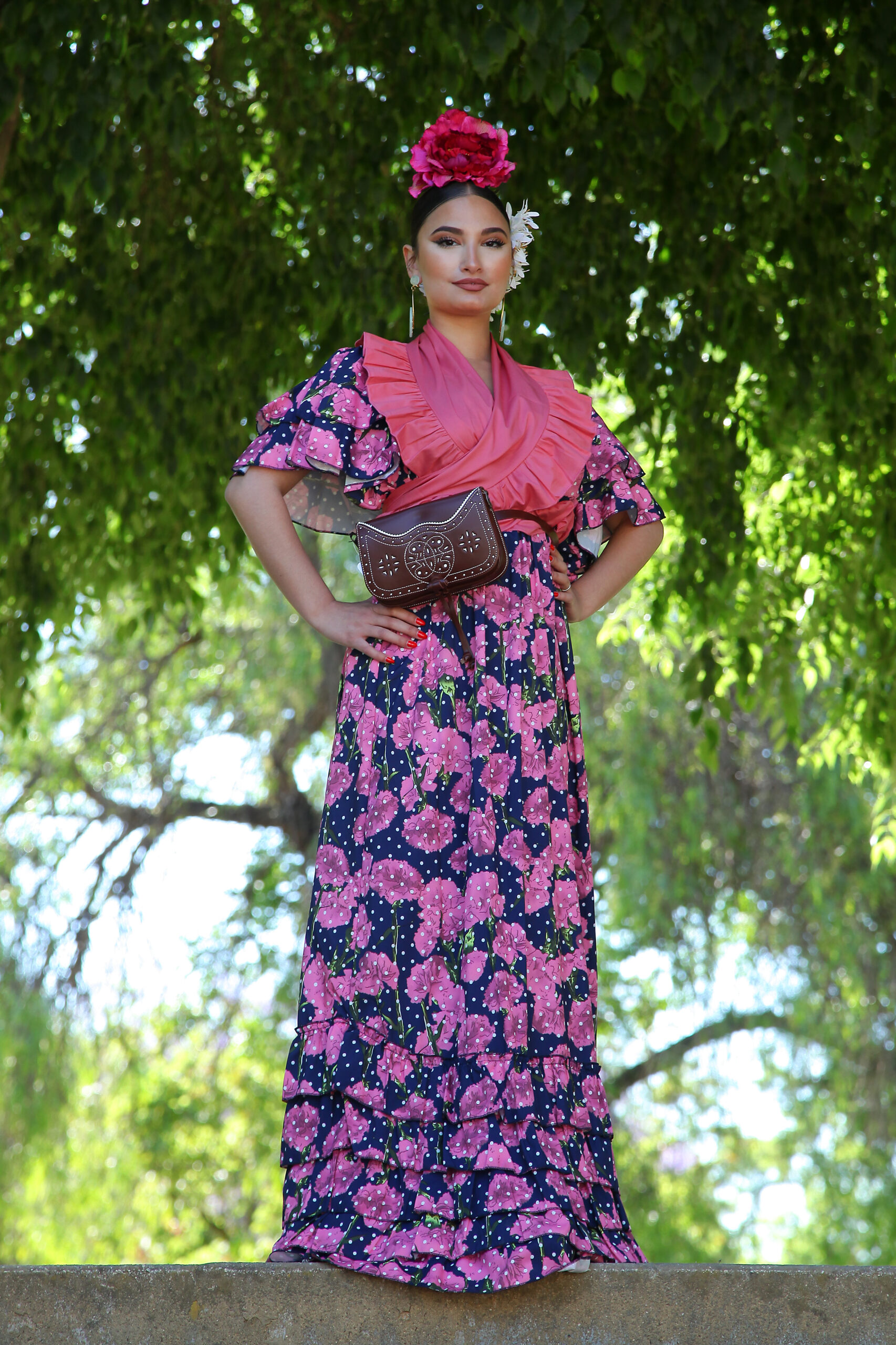 Bata rociera de volantes con estampado de flores y fruncido en el pecho con mangas de volantitos.