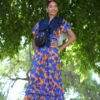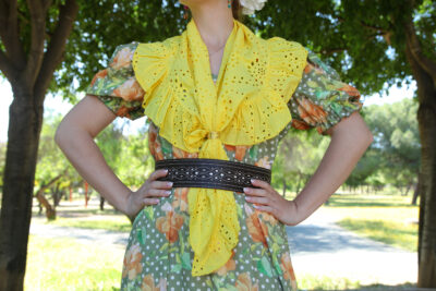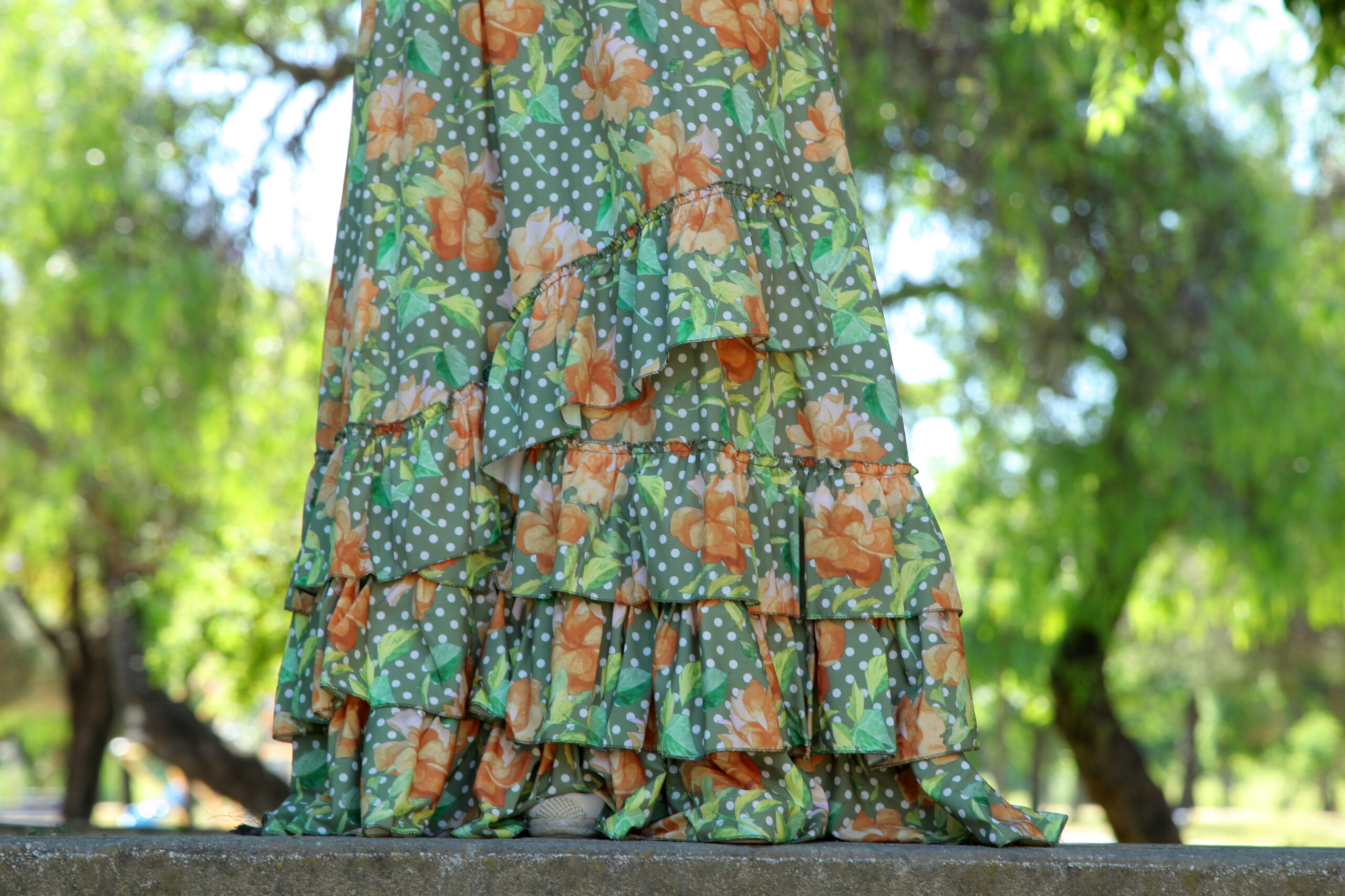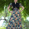 Bata rociera de volantes con estampado de flores y fruncido en el pecho con mangas de volantitos.