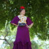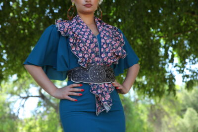 Bata de romería en licra elástica que realza la silueta con comodidad. Diseño mangas adornada con volantes que aportan movimiento.