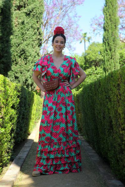 Bata rociera de volantes con estampado de flores y fruncido en el pecho con mangas de volantitos.