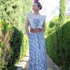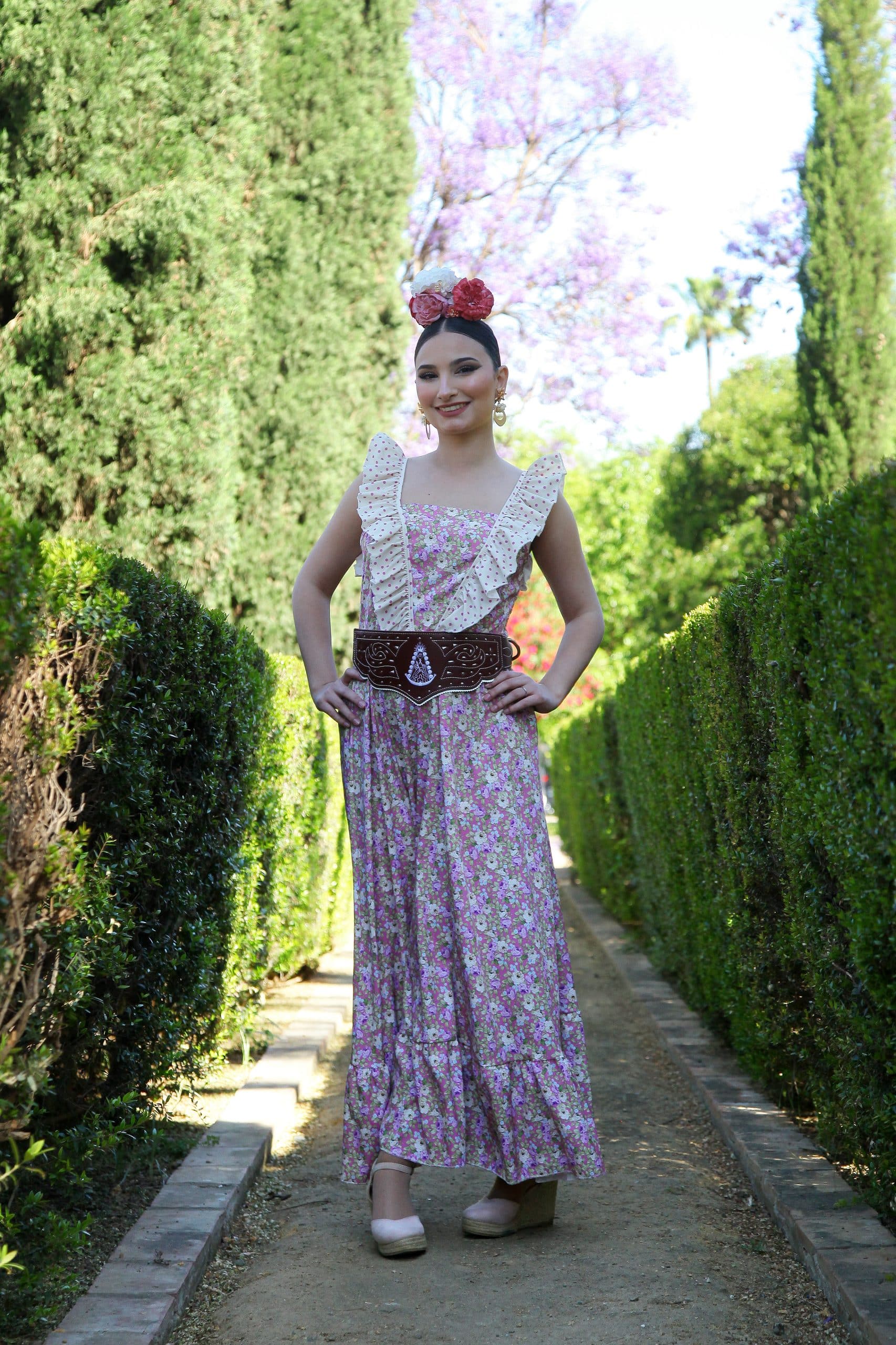 Bata rociera con tejido fluído en tono rosa empolvado con flores malva.