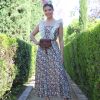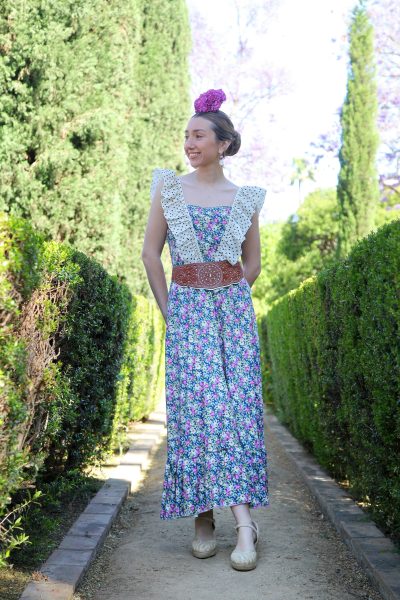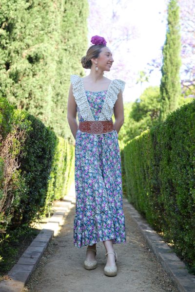 Bata rociera con tejido fluído en tonos azules con estampado de flores.