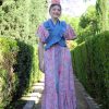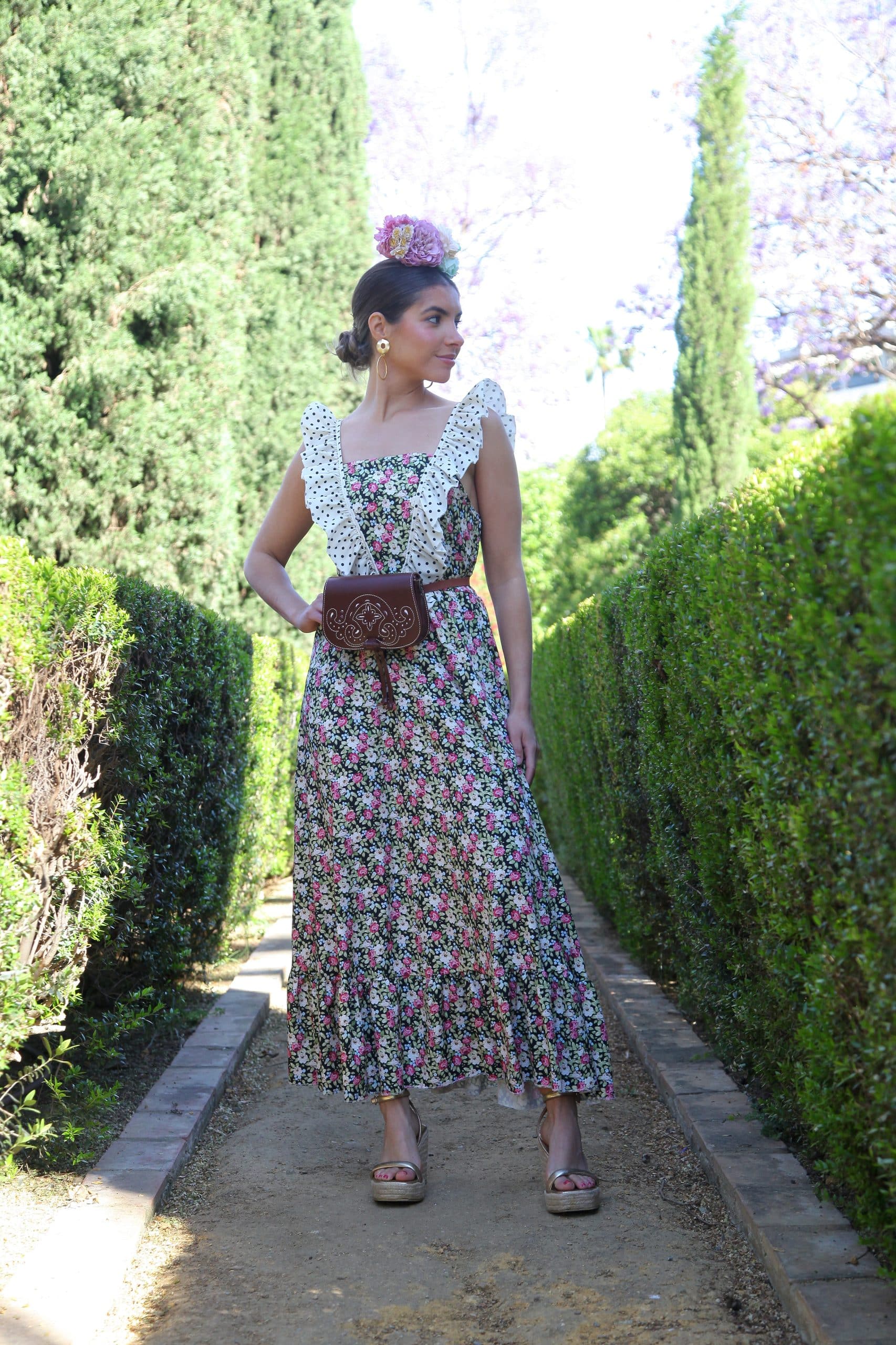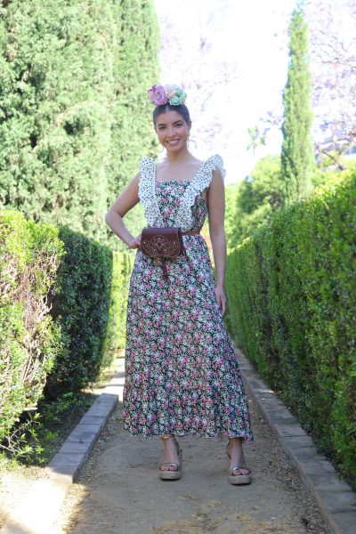 Bata rociera con tejido fluído en tonos negros con estampado de flores.