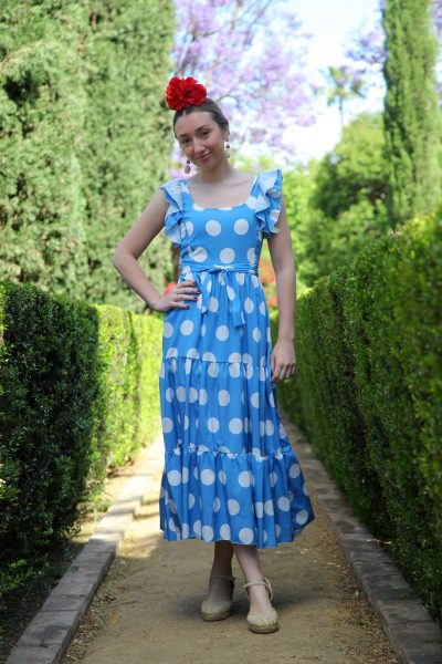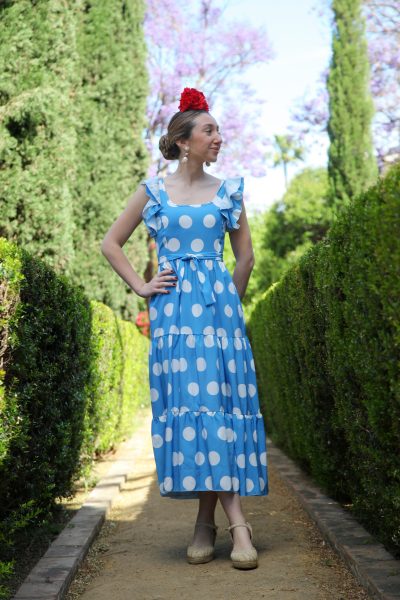 Bata rociera de lunares en tono azul, fruncido en la espalda y volantes con escote de barco.