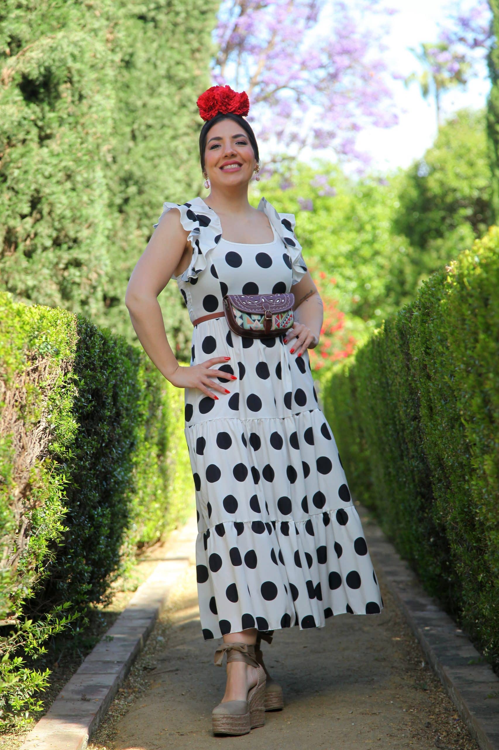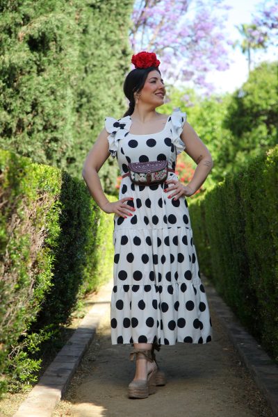 Bata rociera de lunares en tono blanco, fruncido en la espalda y volantes con escote de barco.