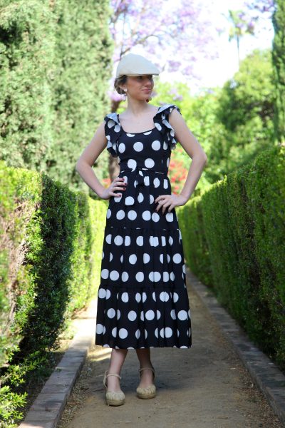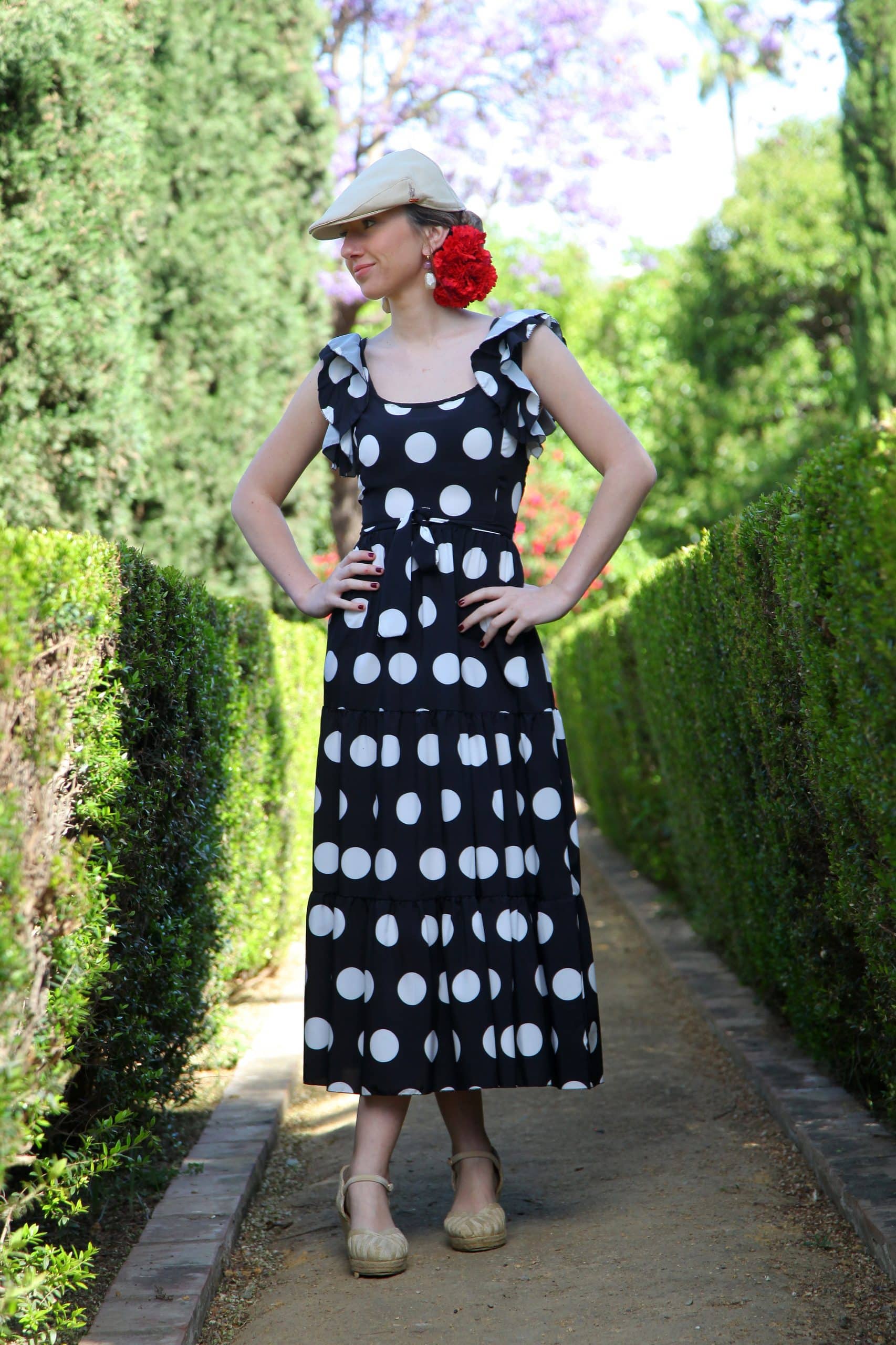 Bata rociera de lunares en tono negro, fruncido en la espalda y volantes con escote de barco.