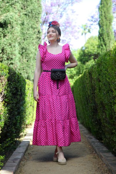 Bata rociera de lunares negros en tono rosa, fruncido en la espalda y volantes con escote de barco.