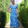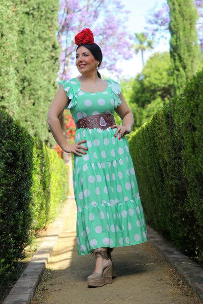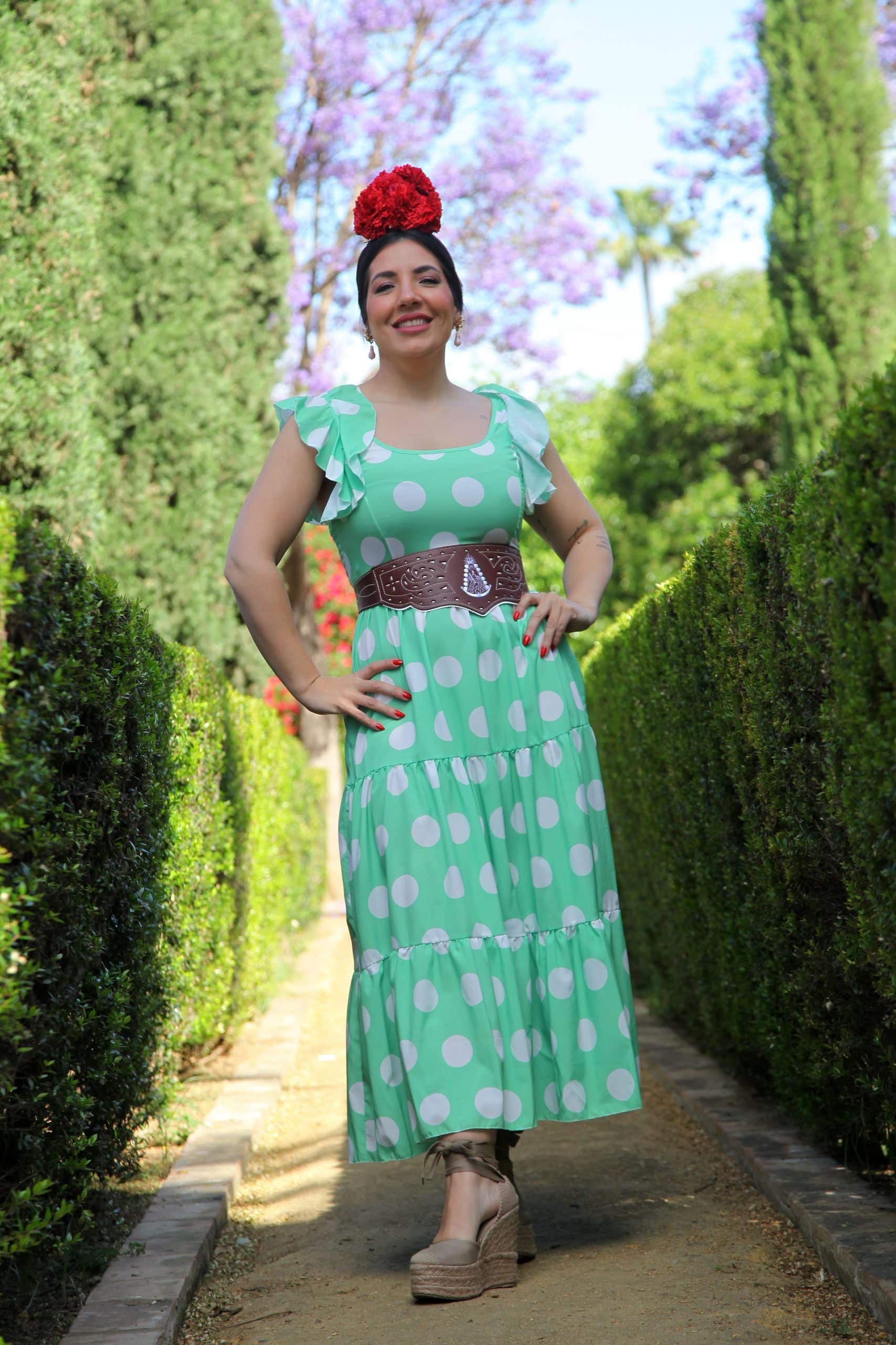 Bata rociera de lunares en tono verde, fruncido en la espalda y volantes con escote de barco.