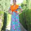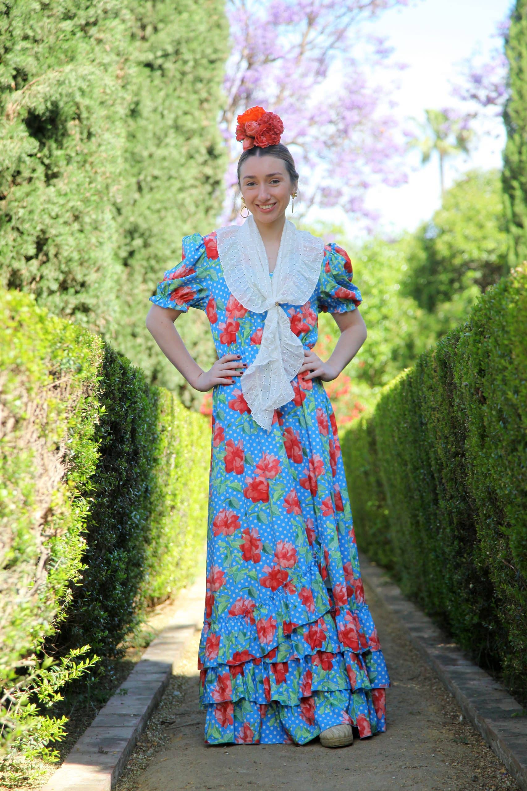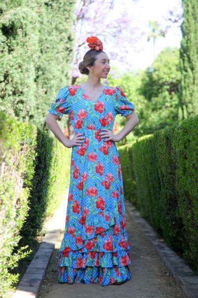 Bata rociera estampada con fondo celeste y flores en color coral.