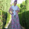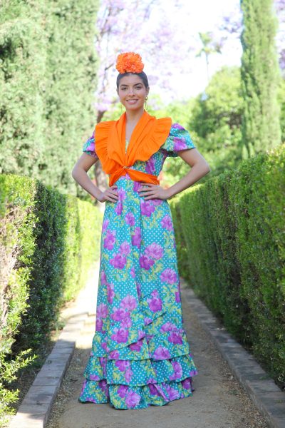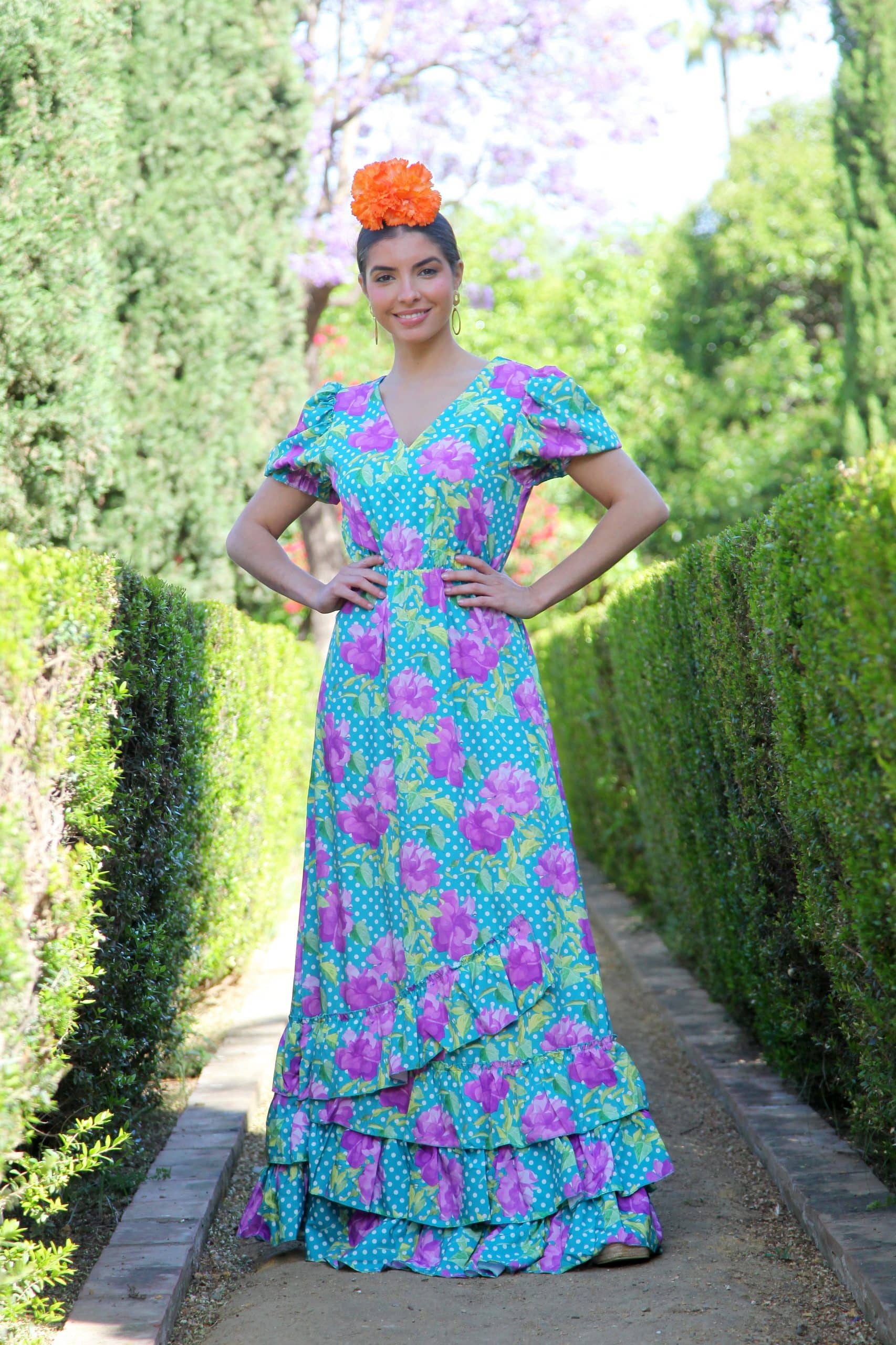 Bata rociera estampada con fondo turquesa y flores en color buganvilla.