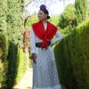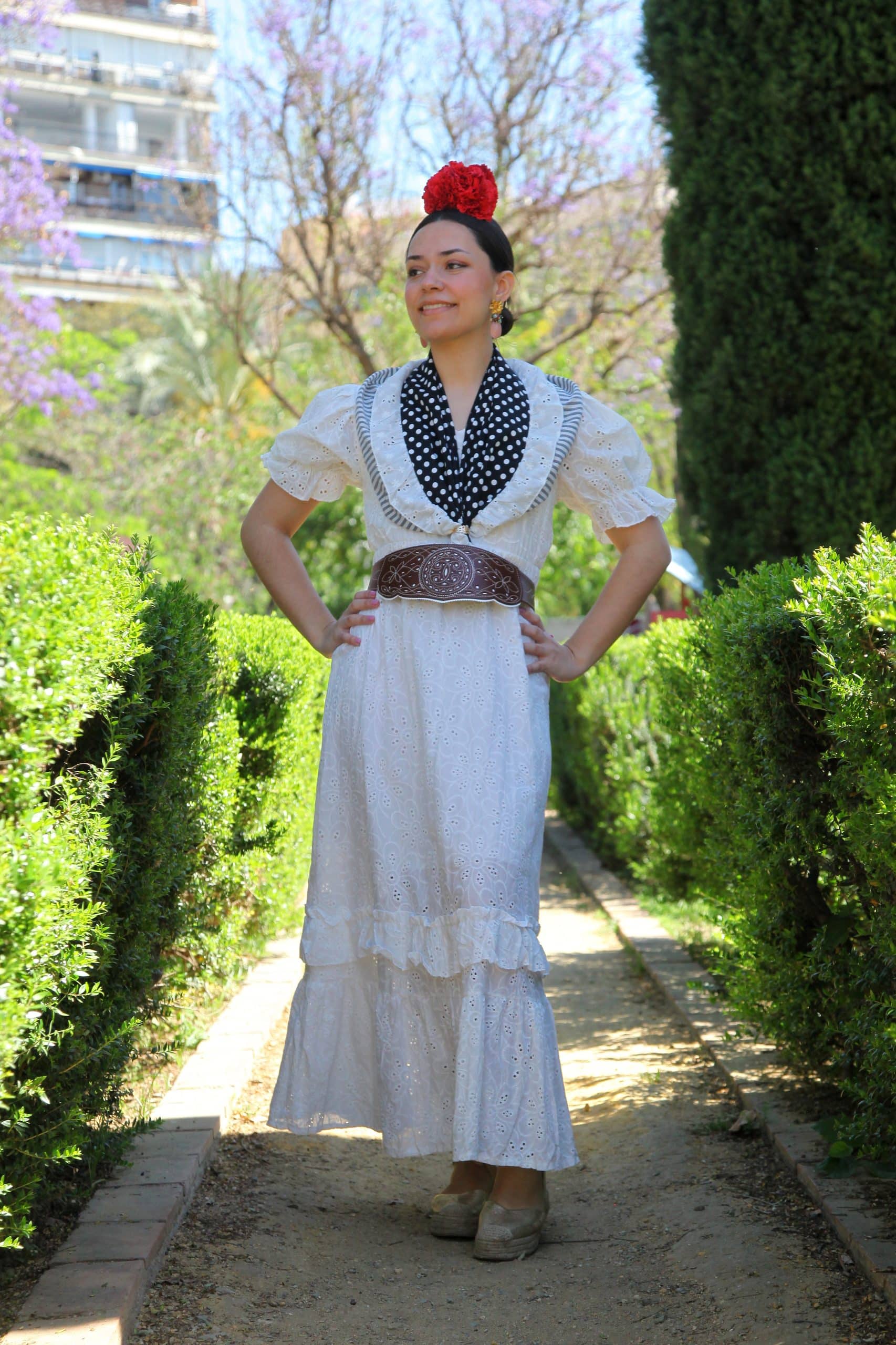 Bata rociera con topitos blancos. Tiene elástico en el pecho y las mangas abullonadas.1,40cm de largo de hombro a pie