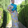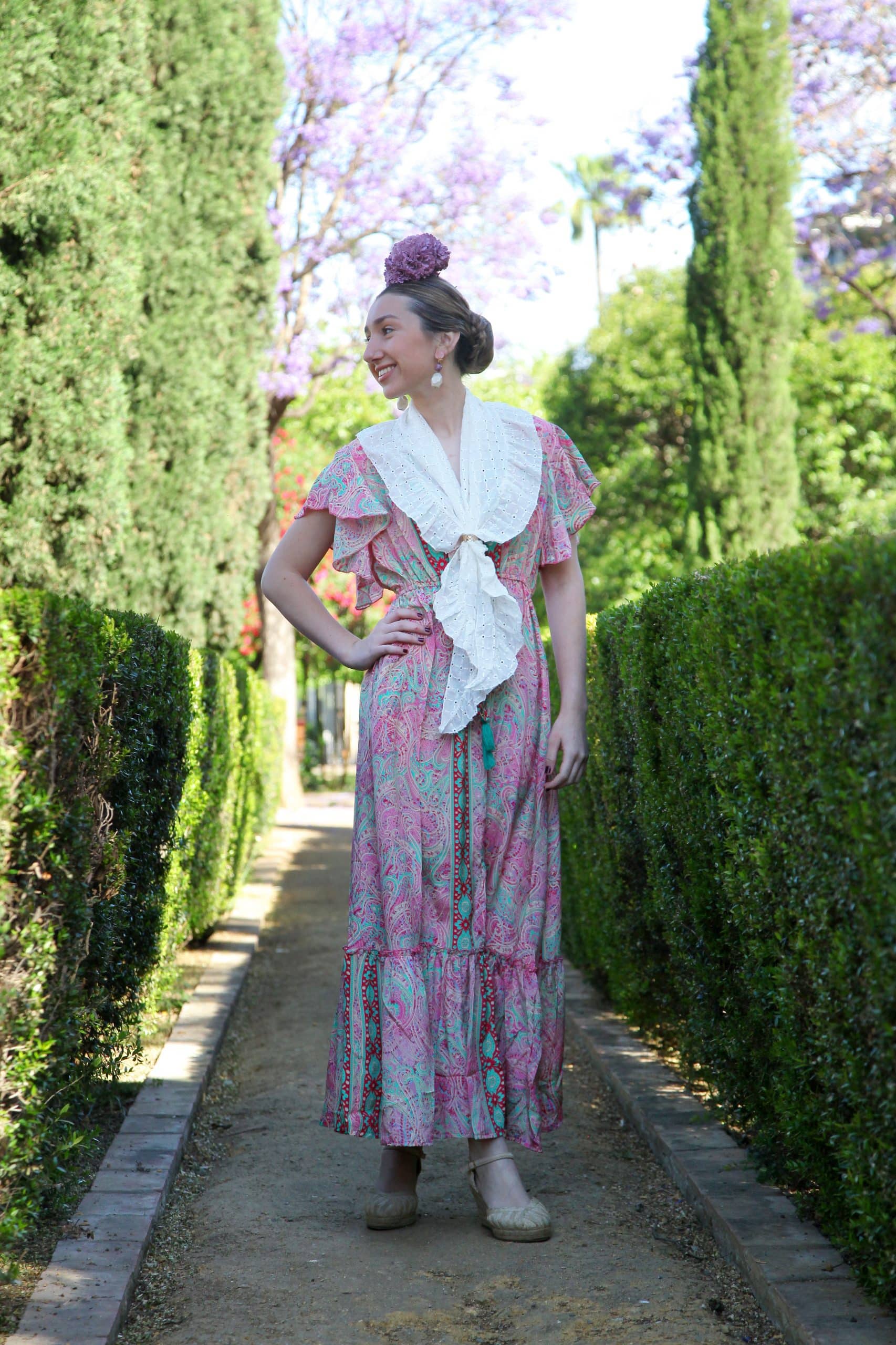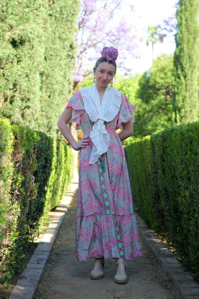 Bata rociera satinada estampada con fondo rosa y turquesa.