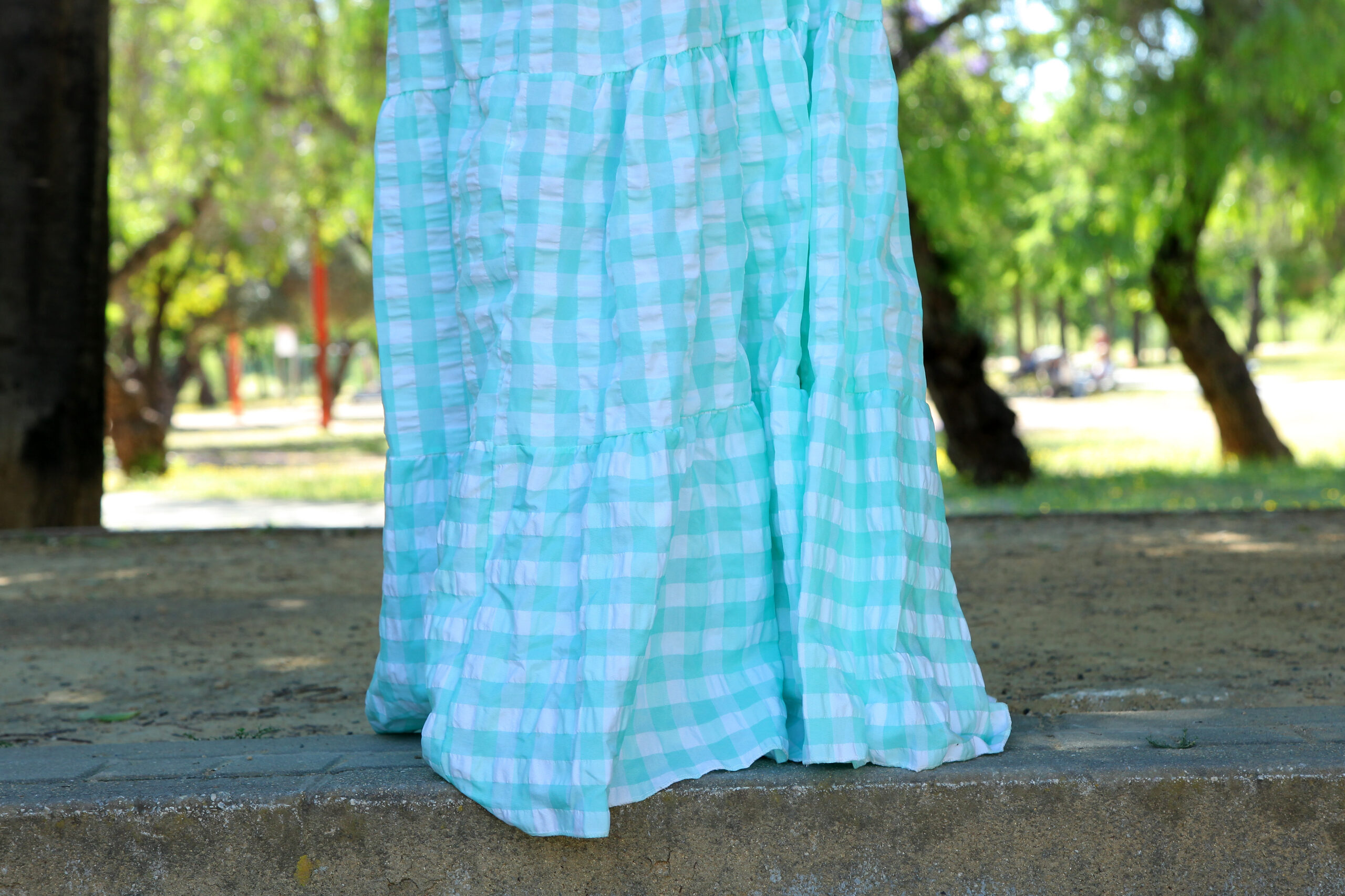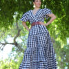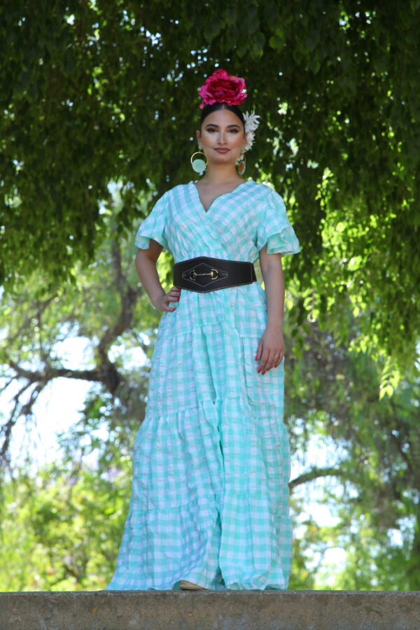 Bata rociera estampada de cuadros vichy en color malva de estilo canastero y mangas cortas.