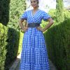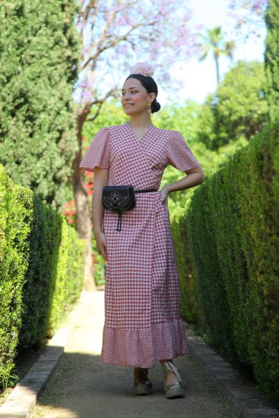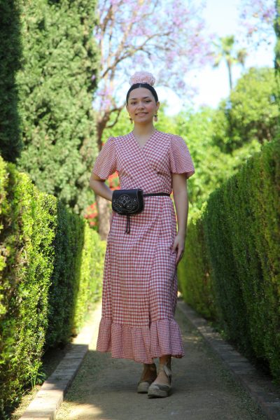 Bata rociera estampada de cuadros vichy cruzado en color caldera y con mangas cortas.