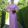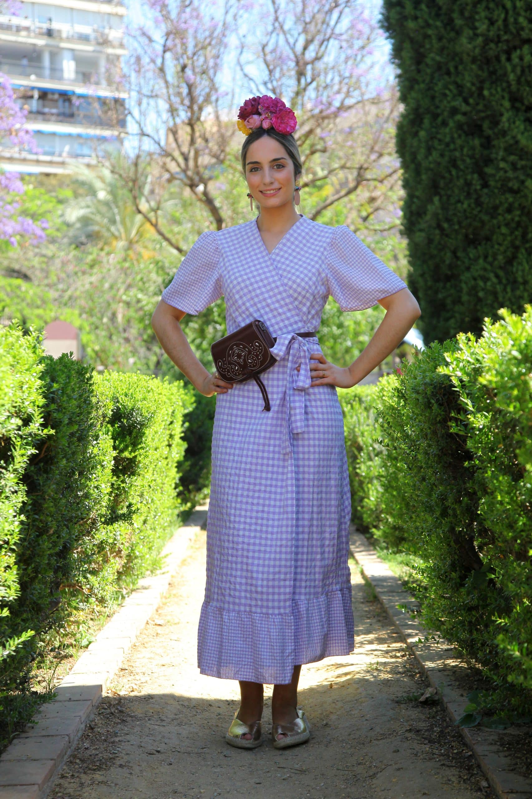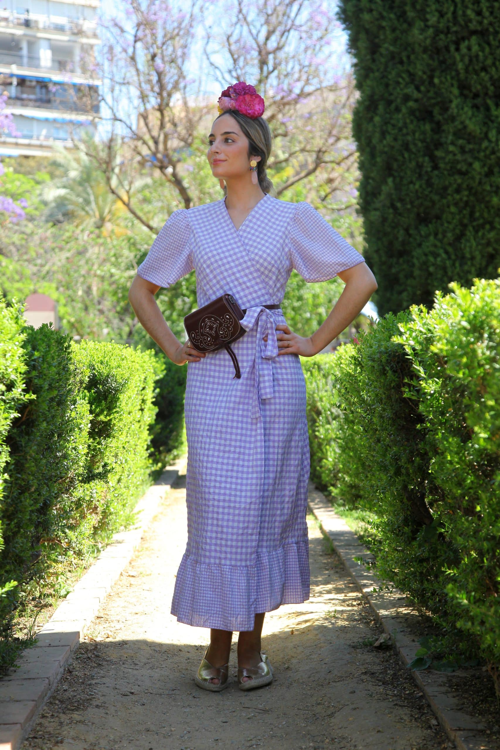 Bata rociera estampada de cuadros vichy cruzado en color malva y con mangas cortas.
