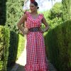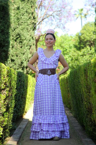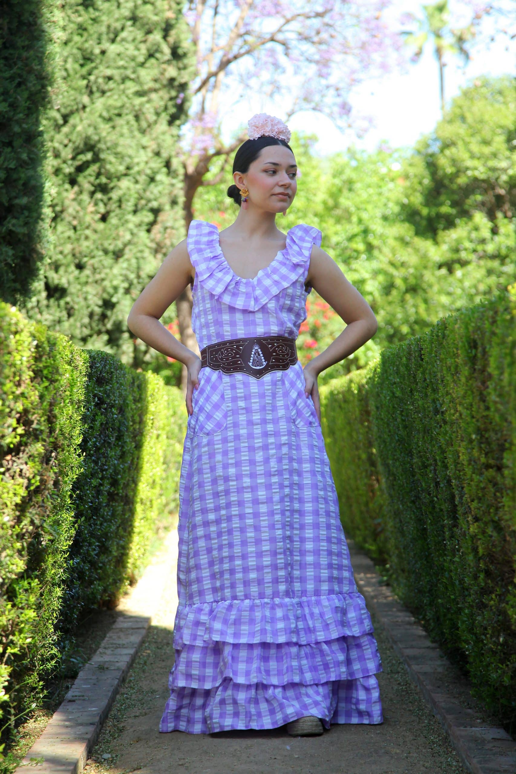 Bata rociera estampada de tres volantes de cuadros vichy en color malva de estilo canastero y sin mangas.