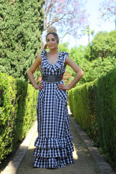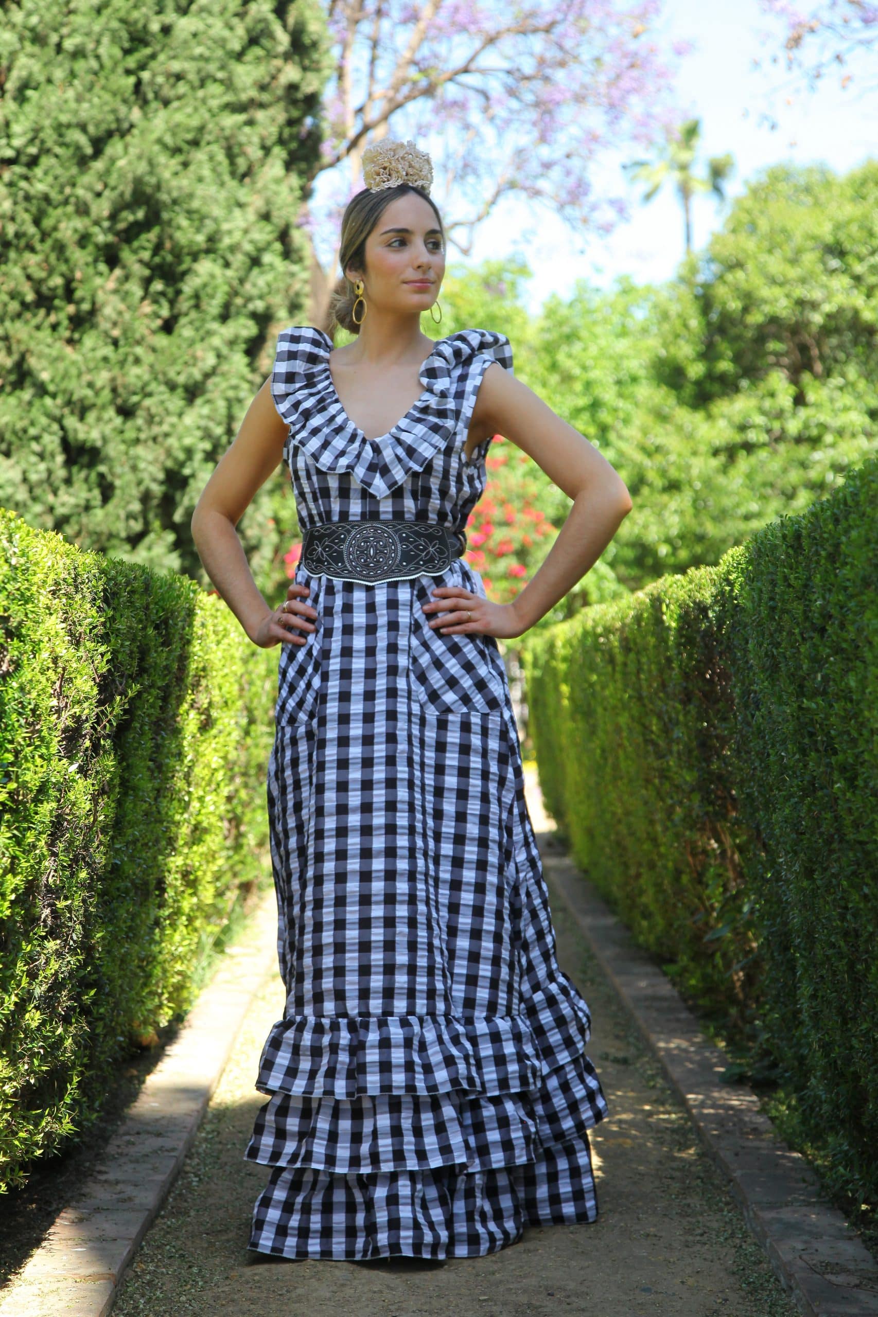 Bata rociera estampada de tres volantes de cuadros vichy en color negro de estilo canastero y sin mangas.