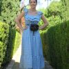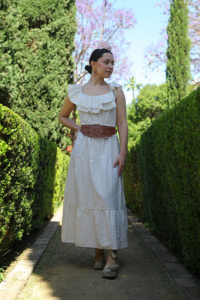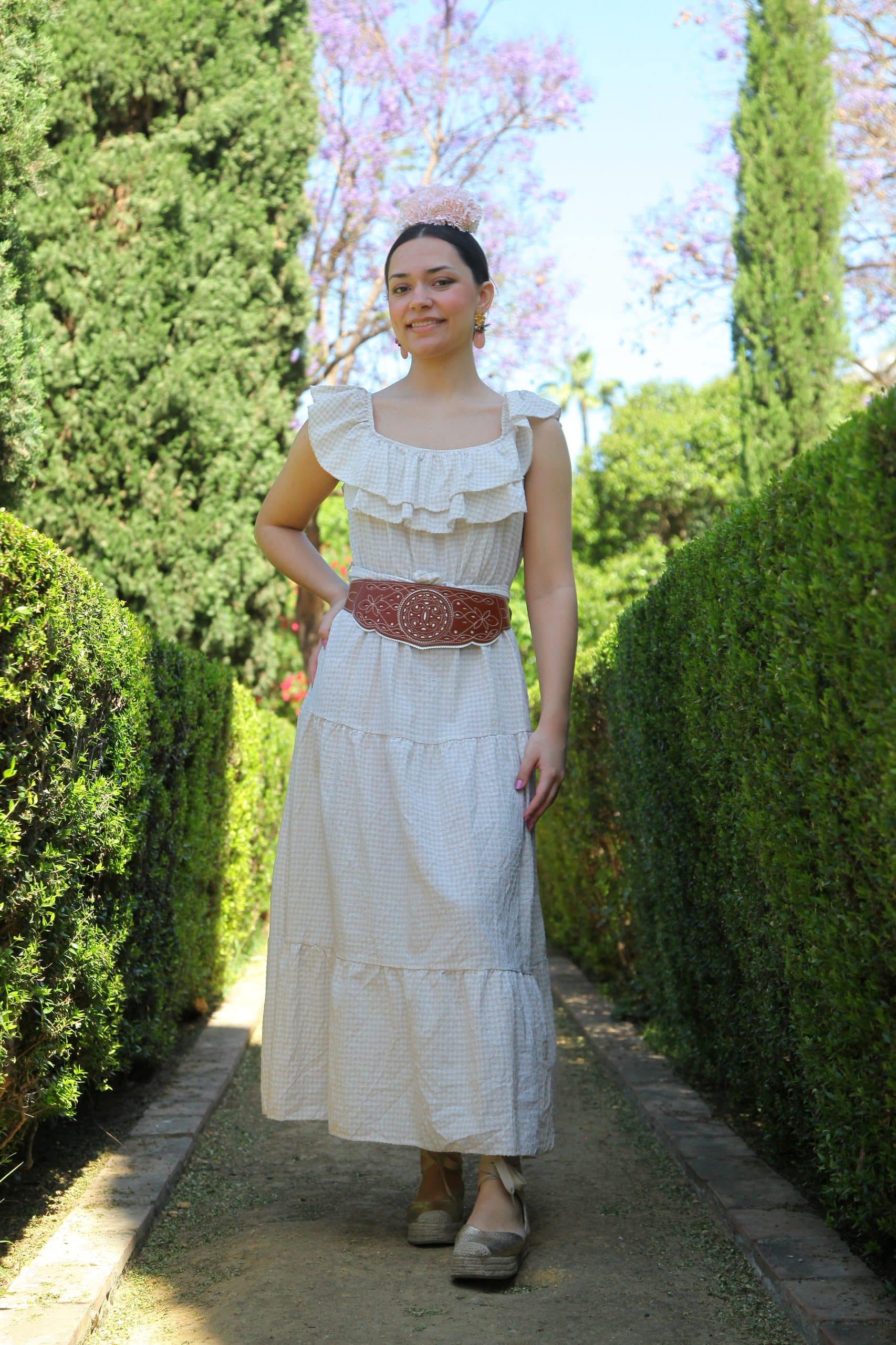 Bata rociera con estampado de cuadros Vichy en tono beige, fruncido en el pecho y volantes con escote de barco.