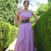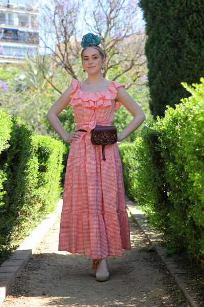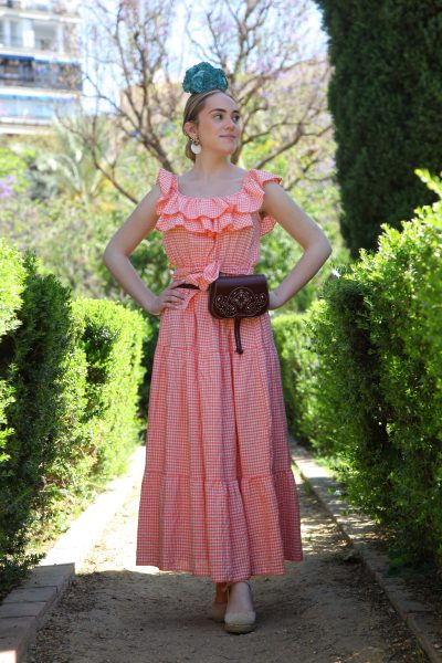 Bata rociera con estampado de cuadros Vichy en tono naranja, fruncido en el pecho y volantes con escote de barco.