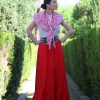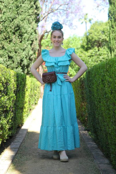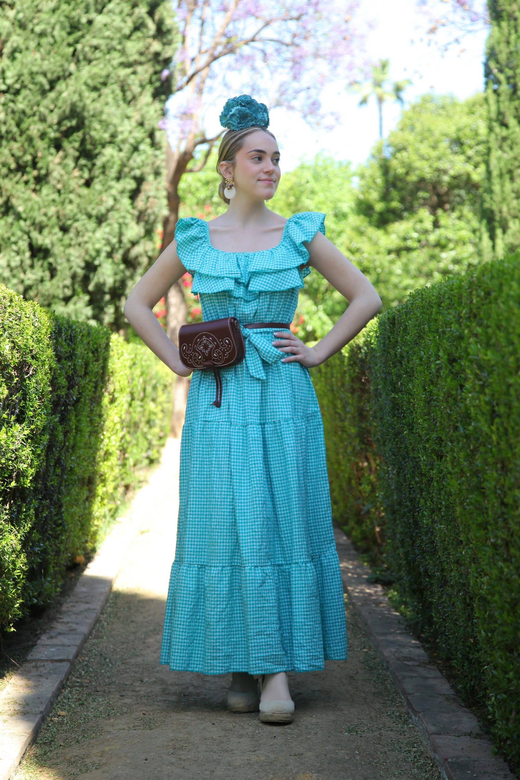Bata rociera con estampado de cuadros Vichy en tono turquesa, fruncido en el pecho y volantes con escote de barco.