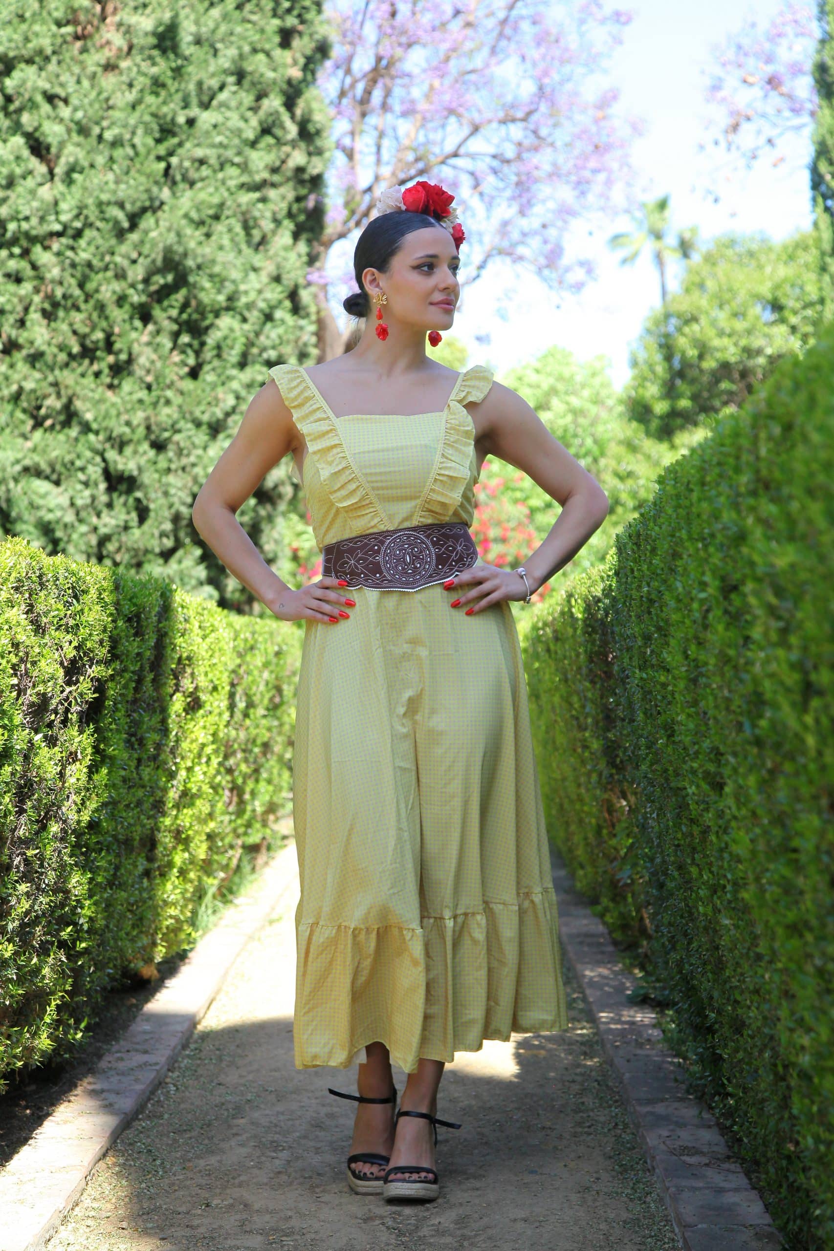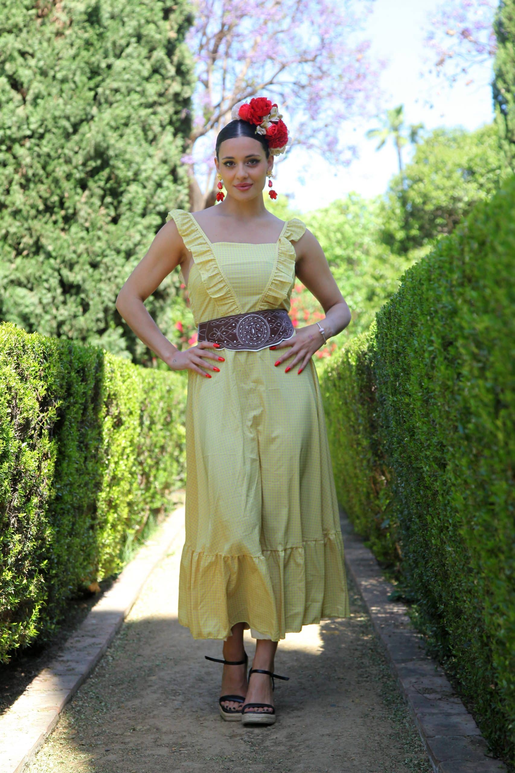 Bata rociera de cuadros Vichy en tono amarillo. Espalda drapeada y tirantas con volantitos.