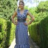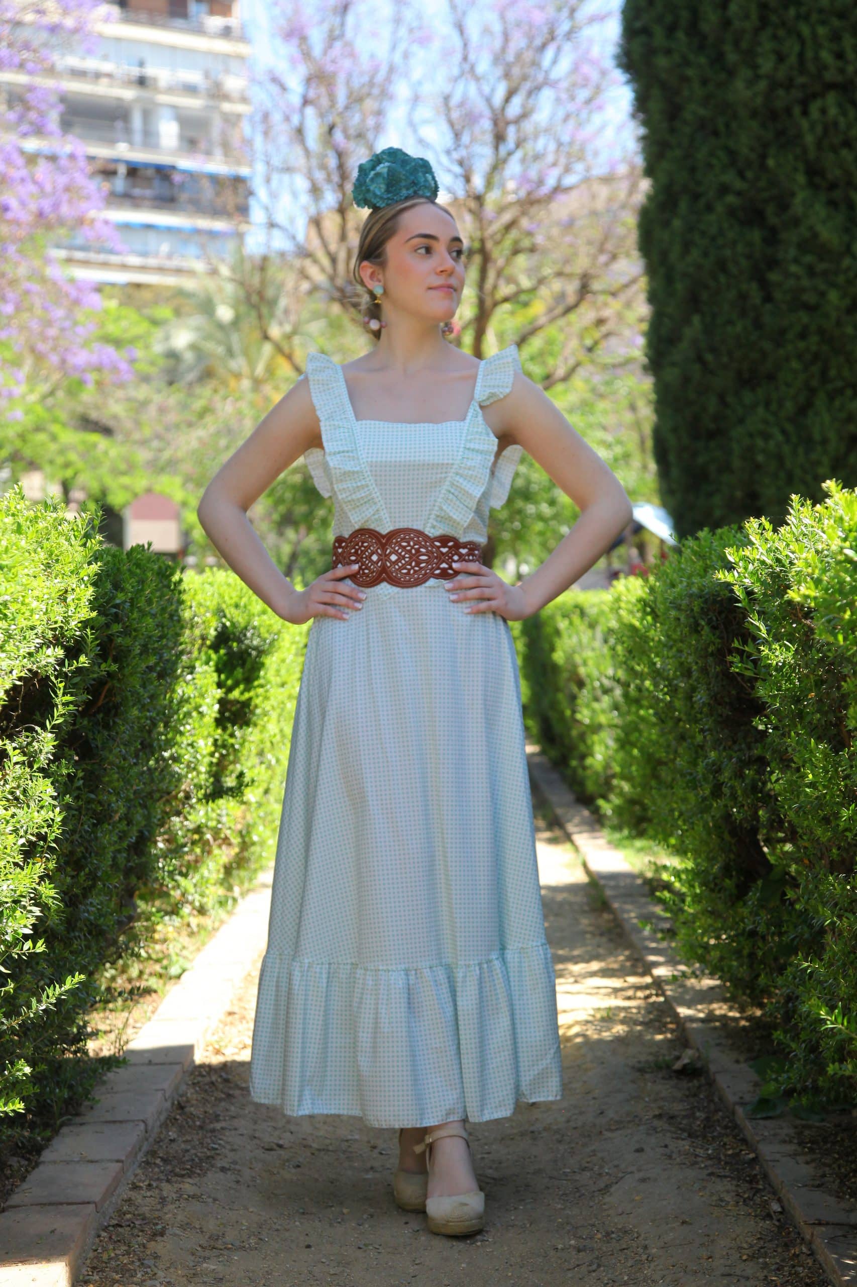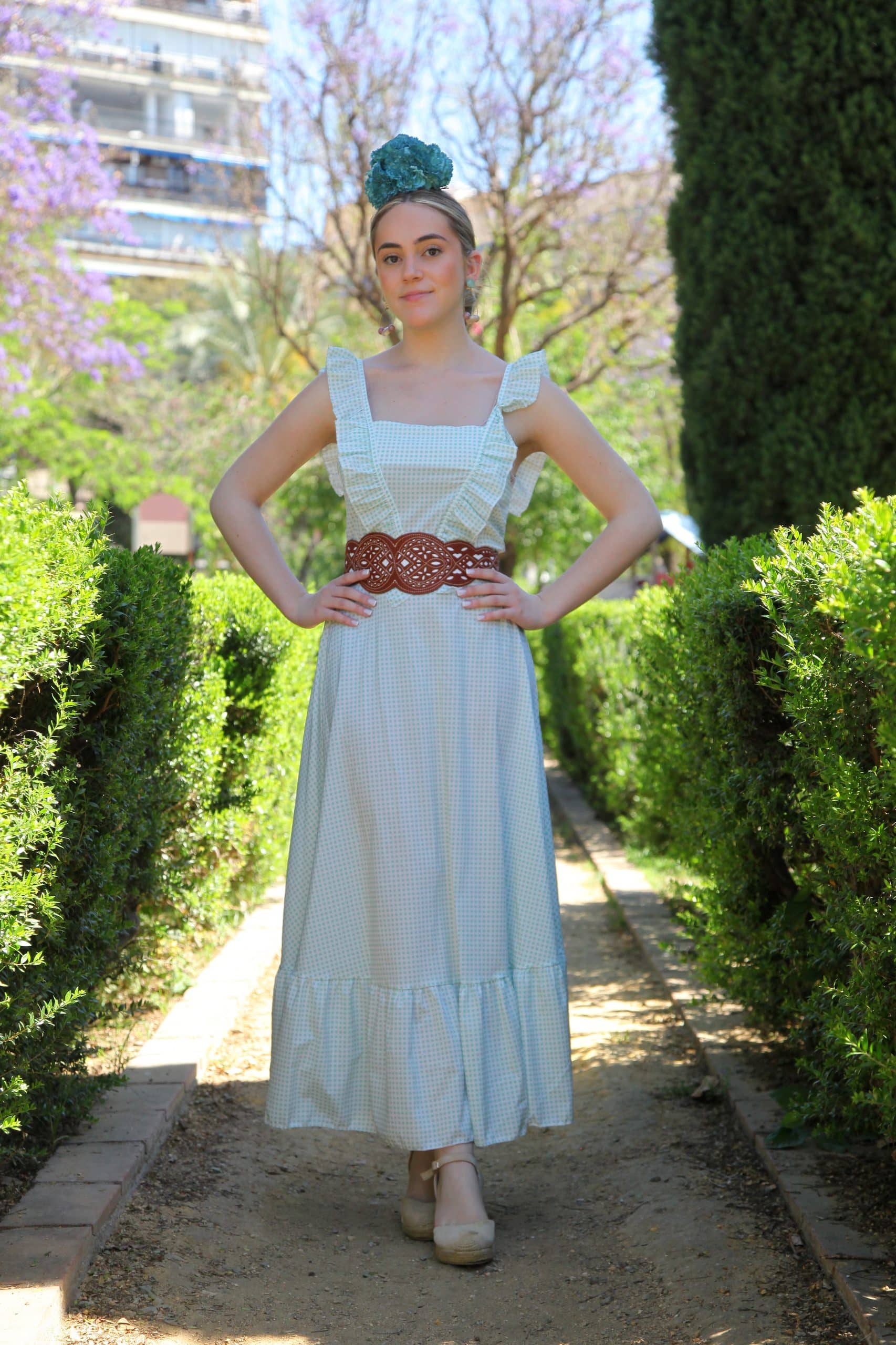 Bata rociera de cuadros Vichy en tono verde agua. Espalda drapeada y tirantas con volantitos.