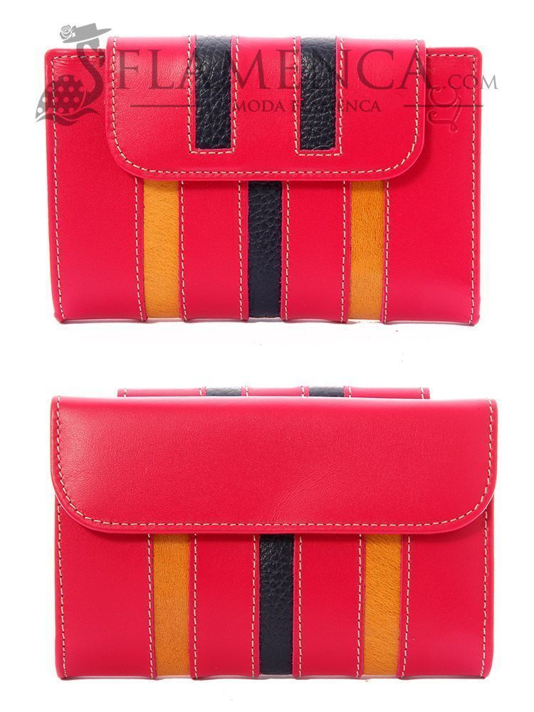Billetera de señora de piel con solapa, en tonos fucsia, azul marino y mostaza, con medidas: 14,5 x 9,5 x 3 cm (ancho, altura y fondo). Tamaño pequeño.