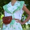 Bolso-bandolera de piel. Fabricado artesanalmente en Ubrique, España. Color Engrasado y terminaciones picadas en fondo Blanco, con solapa, cierre de cordón, y uso de bolso- cinturón tipo riñonera.