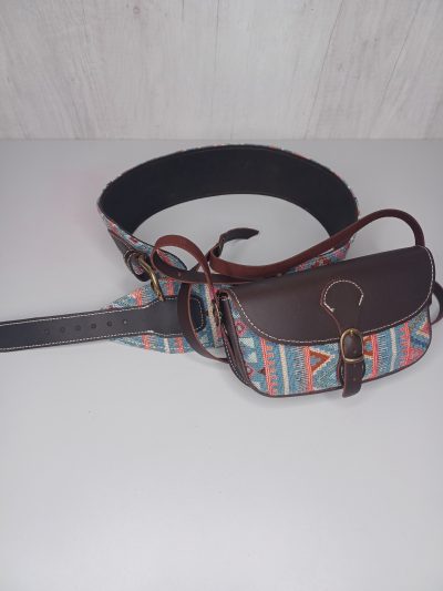 Bolso-bandolera de piel. Fabricado artesanalmente en Ubrique, España. Color Marrón bordado de la Virgen del Rocío y terminaciones picadas en fondo Blanco, con solapa, cierre de cordón, y posible uso de bolso- cinturón tipo riñonera.
